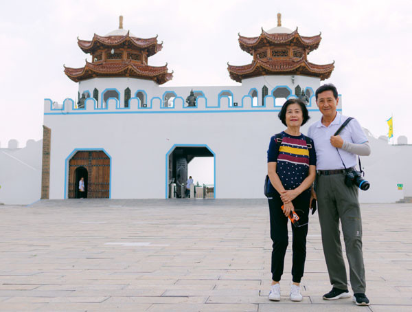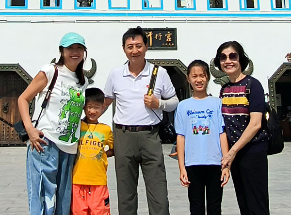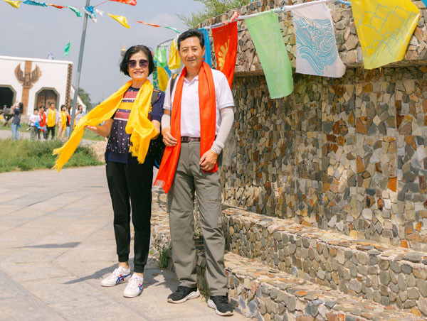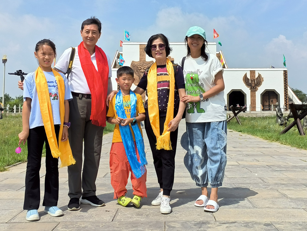 于是,全家人也根据各自的衣服的颜色,选取适合相配色彩的哈达佩戴于身。来到祭天台前时,还请路人帮我们留下了瞻仰大汉行宫的第二张合影。