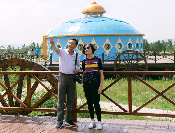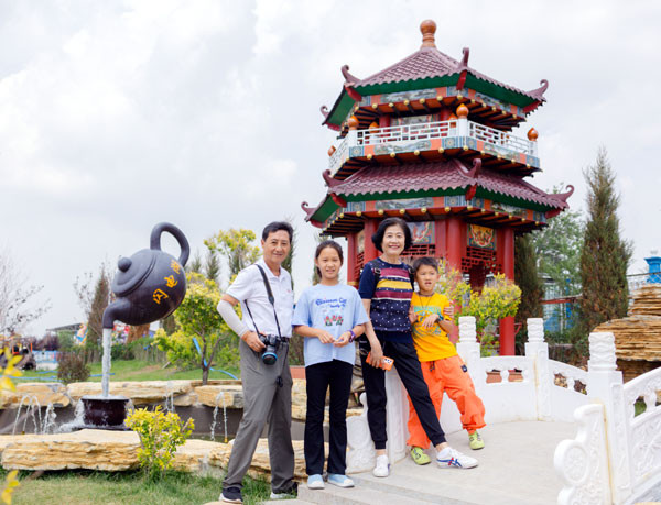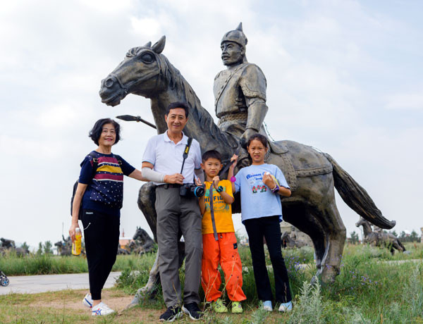 这里位于河北省承德市丰宁满族自治县大滩镇京北第一草原,距承德市区250公里,距北京280公里。景区总占地面积200万平方米,是京北第一草原上规模最大的景区。也是集寻古、观光、娱乐、餐饮、住宿于一体的大型综合景区。在景区门口请路人帮忙拍下了一张此次出行全家福的又一张合影。