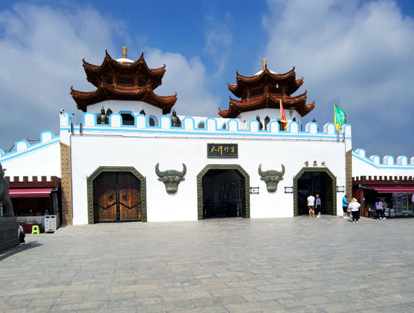 来到大汗行宫景区门前,首先映入人们眼帘的是极富民族时代历史特色的宫门楼。长长的白色城墙中央衬托着威武的宫门--苍狼望天。城楼上方一左一右,对称着的是两个棕色的多角门楼。城墙上方正中,四个金色大字“大汉行宫”在阳光的映照下,金光闪闪赫然醒目。