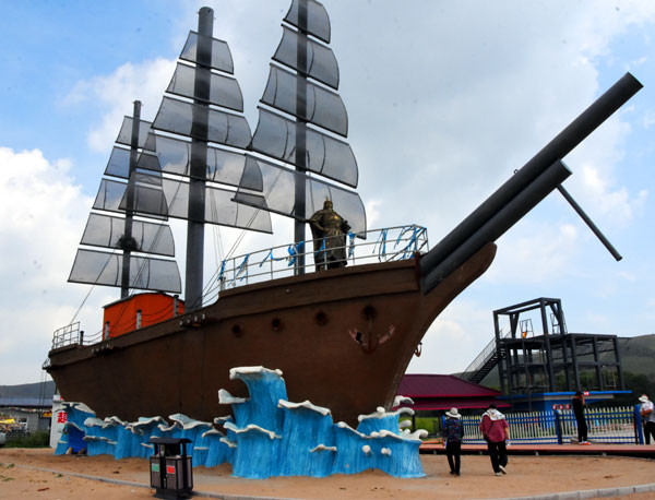 在闪电湖湖畔,有一条郑和下西洋的大木船面向湖畔而立,人们登上船头可以俯瞰闪电湖的湖光山色。湖畔还有不少可以骑乘的马匹,喜爱骑马的游客,可以在此扬鞭飞驰感受一下湖畔驰骋的乐趣。