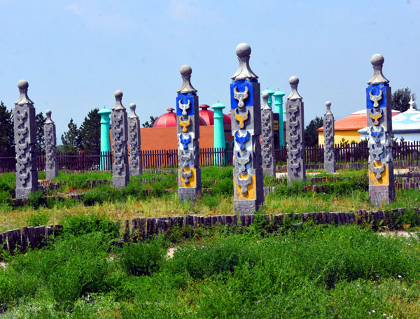 祭天台下面的祈福长廊两边所挂的牛骨,是古人祈福用的。牛羊是蒙古人衣食住行中最重要的食物来源,用牛骨祭祀天地以表达蒙古人对天地的敬仰,脚下的石砖,绘有奔跑的骏马,寓意马到成功。