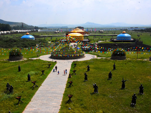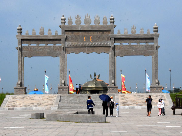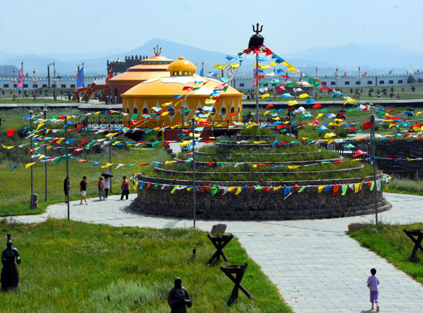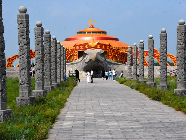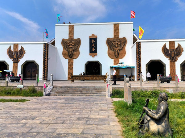大汉行宫景区的宫殿区占地30万平方米,主要由崇天门、军帐、金帐、寝帐、敖包、祭天台、历史长廊等建筑构成。