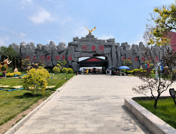 我们进入景区后,首先在一个亭台前的小桥流水处留影,这里一个黑色庞大的吊壶造型,溪水顺着壶嘴倾斜而下,壶的上方,“闪电湖”三个黄色大字十分醒目。