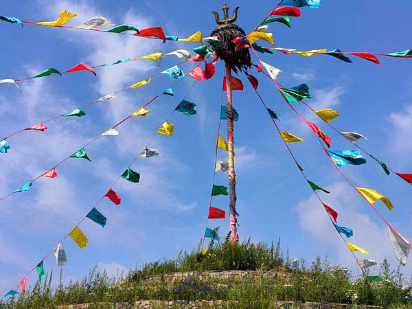 最后抵达到中轴线顶头的祭天台。在即将到达景点前路边的一个服务台,有工作人员热情的告诉游客,人们可以凭门票在此免费取一条哈达,以备到接下来的祭天台及祈福长廊上祭祀敬献。