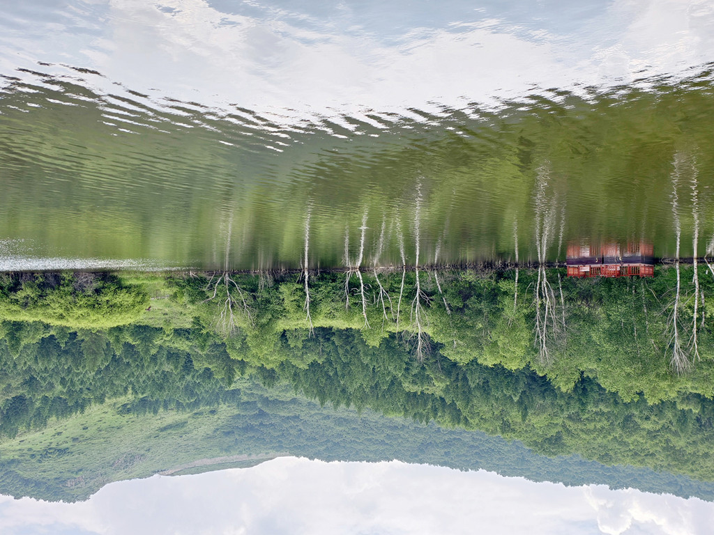 2.金莲湖镜面倒影:天空之镜倒映白云,穿白裙拍“触手摘云” 草原上的小亮点。