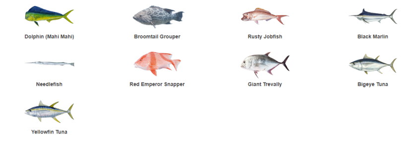 Dolphin Fish(Mahi Mahi)鲯鳅、Broomtail Grouper 帚尾喙鲈、Rusty Jobfish 锈色细齿笛鲷、Neddlefish 颌针鱼、Snapper(Red Emperor)红帝王鲷、Trevally(Giant)巨型珍鲹、Tuna(Bigeye)大眼金枪鱼、Tuna(yellowfin)黄鳍金枪鱼