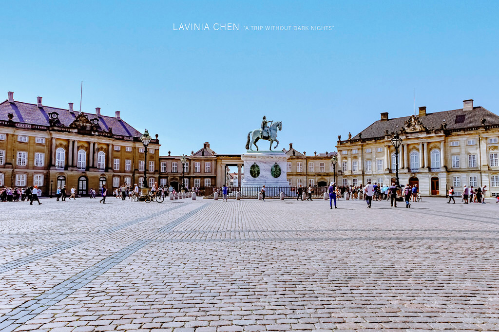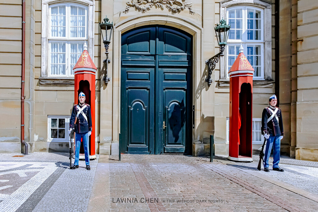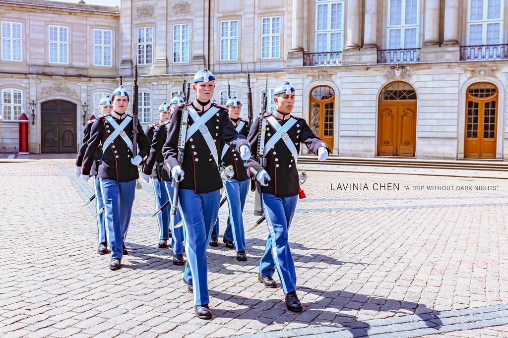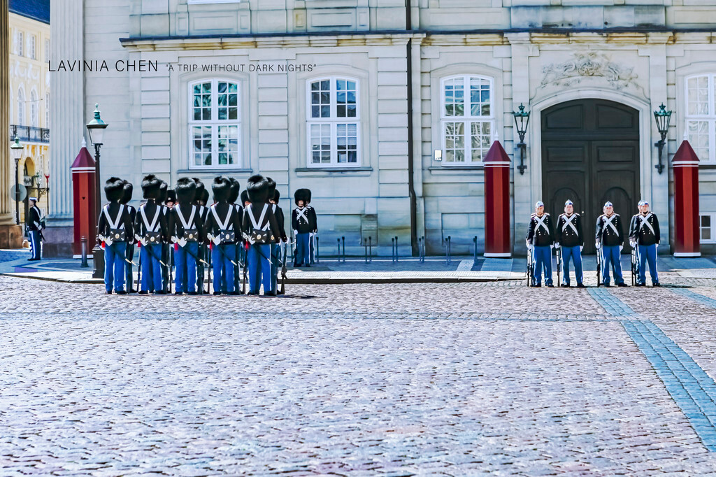换班仪式在阿美琳堡宫前,阿美琳堡宫是丹麦现在的皇宫。与瑞典皇宫不同的是,丹麦王室还居住在里边。如果你看到广场上的旗帜是升起状态的,那说明丹麦女王正住在里面。
