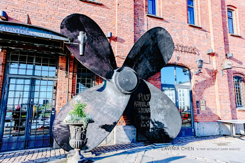 岸边有很多小店,我不认识芬兰语言,但我认识数字呀。能看出营业时间和价格,应该是把店面的宣传写在这个巨大的装饰风扇上了,很有意思。