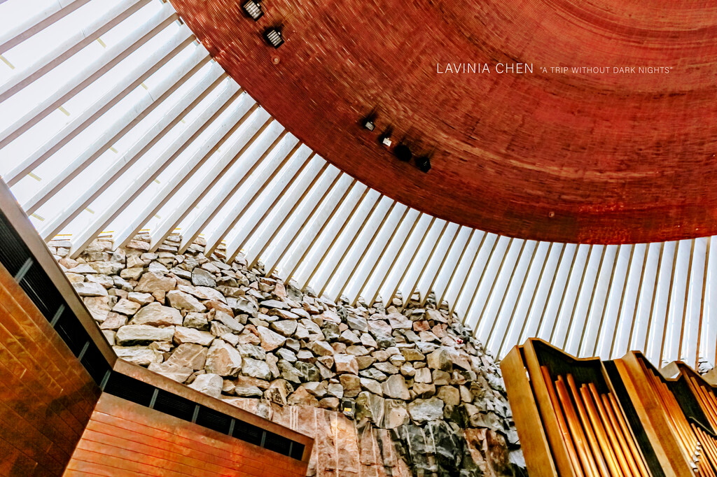 岩石教堂的用铜片镶饰外部墙面,里边儿则完全保持了天然的花岗岩石壁纹理,显示出了芬兰人崇尚自然古朴。