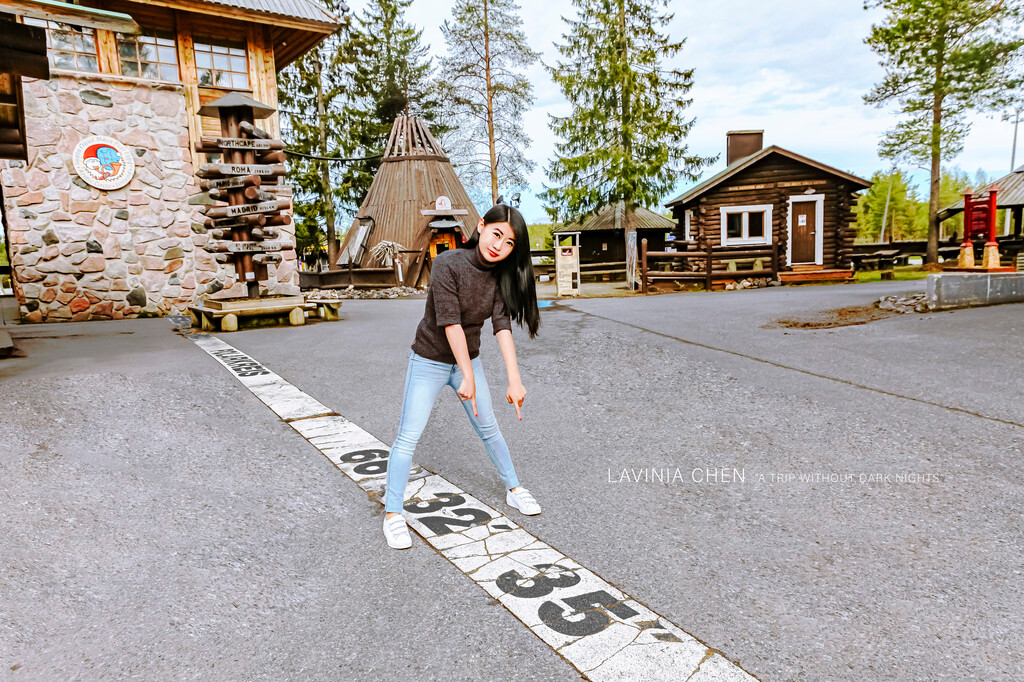 在圣诞老人村的中心区域,有一条写着“Arctic circle”“66°32′35”的白线,就是北极圈线了。