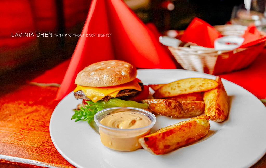 我点了一份汉堡和薯角,金黄的食物和红色的背景,圣诞的bling bling感立马就出来了。