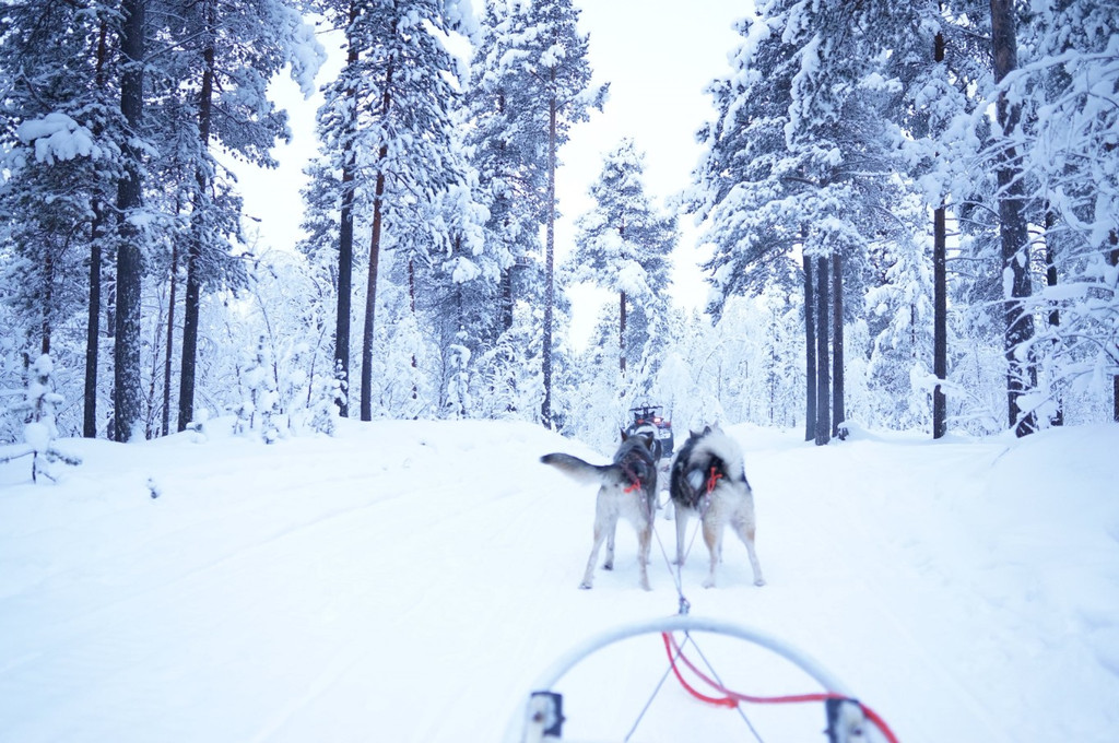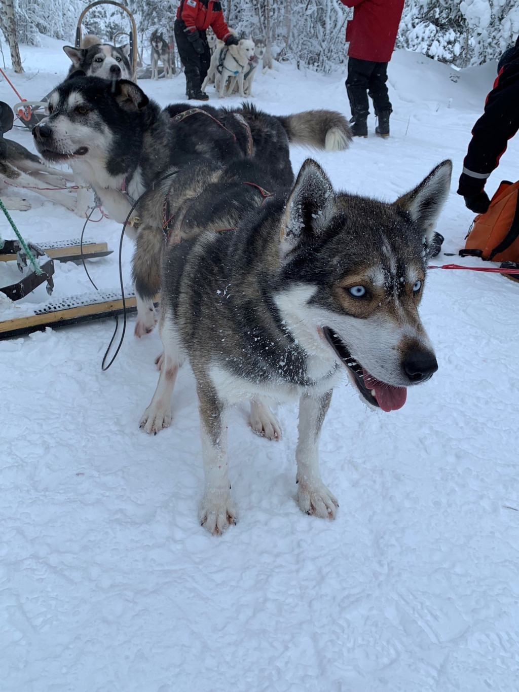 哈士奇雪橇是最好玩的项目,没有之一。玩之前一定要做好保暖,我穿的保暖内衣、毛衣、羽绒服、羊毛裤、滑雪裤,外面套了club的连体保暖衣,真的好塞,穿上后感觉自己动不了啦。穿了两双袜子,戴了一个毛帽子再加羽绒服的帽子,够了,两只熊啦。六个人一组,两个人一辆车,一个坐在雪橇里,另一个站在后面负责驾驶。教练讲了下驾驶要点,其实就是像骑自行车那样,别较劲,随着车的方向动。哈士奇们已经跃跃欲试啦,我们出发啦。伊伐洛的哈士奇真的很好玩,带你穿树林,一车宽的小路,两边是耸立的树林,时而有上下坡路,下坡的时候超级爽。狗狗很兴奋,使劲的向前冲,累的又是放屁又是拉屎,狗屎真是好臭好臭,熏死我了(晕小蜂)