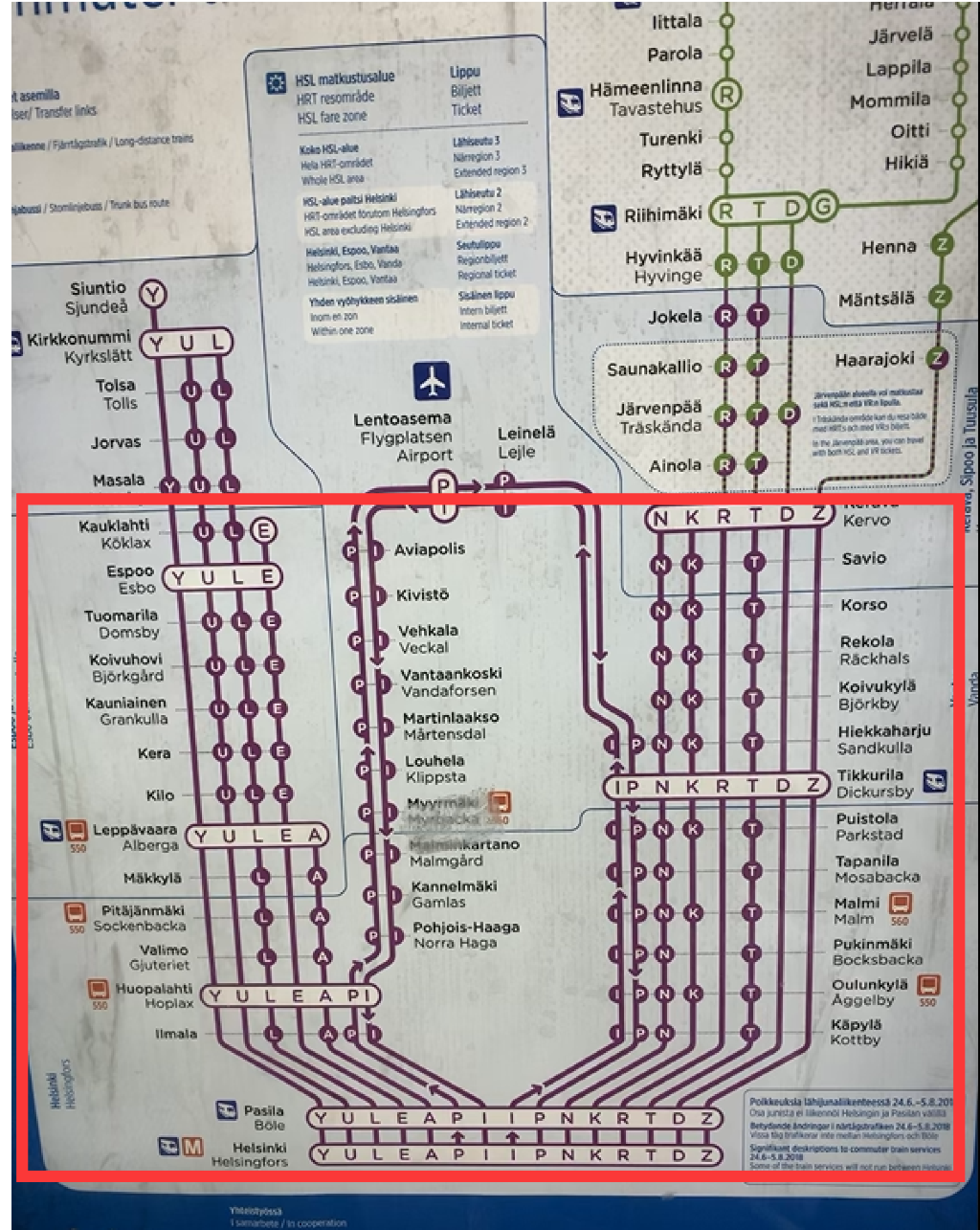 因为时差问题,早早起床了,吃过早餐,乘坐机场巴士到机场,再转地铁去市中心转转。机场巴士是有列车时刻表的,20分钟一班,很方便,不过不太准时,尤其是早上。到了地铁站,有自动售票机,有单程票,也有日票,公共交通全部都能乘坐(地铁、公交等等)。我们买了赫尔辛基市区的日票,地铁站有路线图,但是我们真的是看不懂,还是咨询的地铁服务人员,最后就是大体意思红框内的可以坐,超出范围就要额外买票啦。对了注意一下自动售票机现金是不找零的,可以刷卡,但只能是芯片卡(VISA或MASTER).