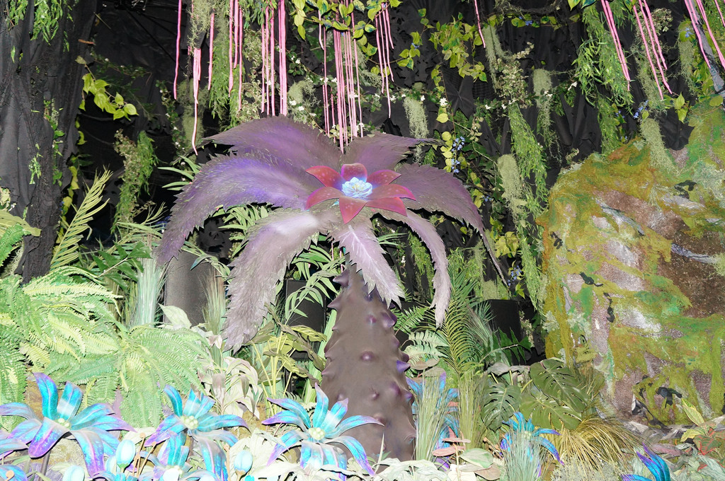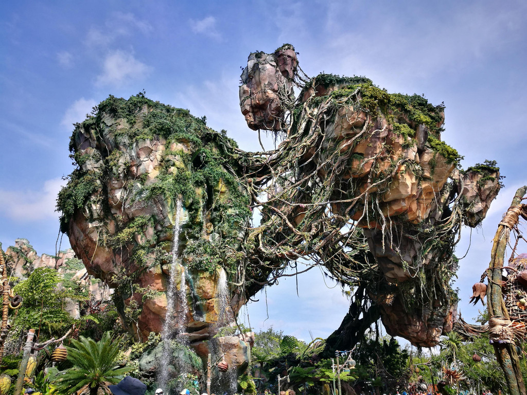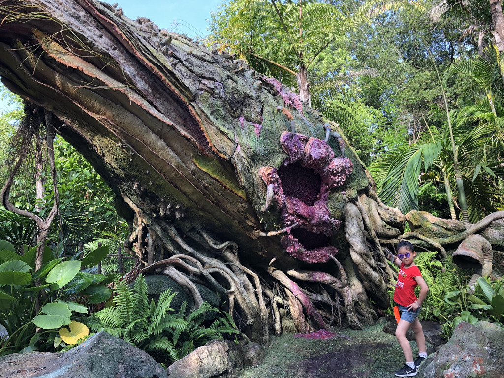 Animal Kingdom这几年和阿凡达合作,开辟了全新的Pandora园区,里面有Na’vi River Journey和Avatar Flight,可以欣赏潘多拉星球的景色。我们入园后,直奔该园区,趁排队人还不多时,乘坐Na’vi River Journey。外国人真的是非常守秩序,排队时没有人插队,也没有人推推搡搡,就算你没有跟上,前面空了一大块区域,也没有人催你,也没有人插上去,排队区域一点儿也不吵闹。大概排了三刻钟左右,轮到我们了。这个项目就好像是山洞里的暗河漂流,两边有阿凡达的各种人物,头顶上还有星星点点的动植物,而且山洞里又凉快,一边避暑,一边身临其境欣赏潘多拉星球的美景,十分惬意。而园区里另一个项目Avatar Flight,无论何时排队都是超过三个小时,而且FP上永远预定不到,好吧,果断打消玩的念头吧。