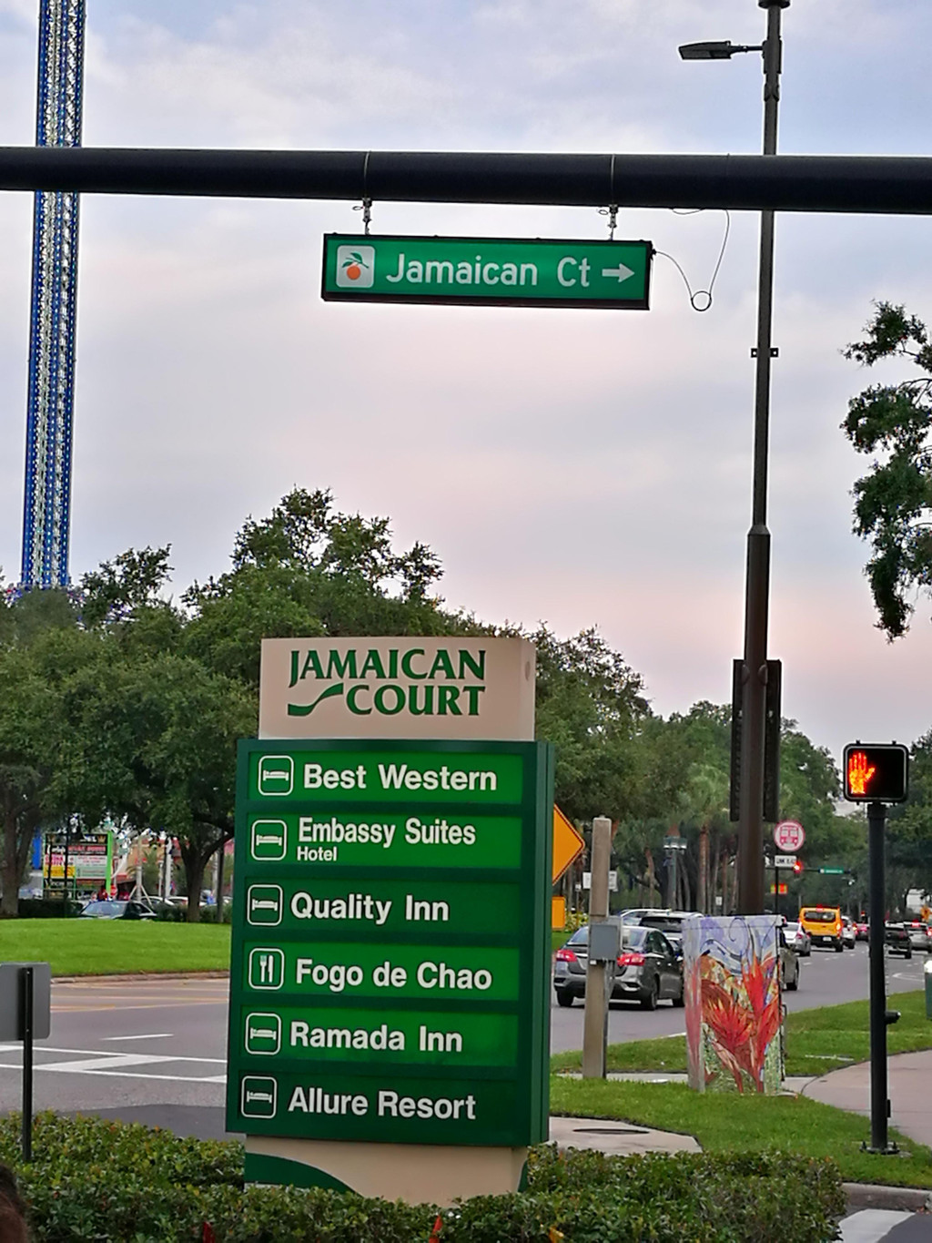 晚上七点左右,我们开车回到了酒店。我们住的酒店所在的道路旁Jamaican Court都是酒店,对面也有一些餐馆。过了International Drive大道,还有牛排馆。不过我们今天晚餐的安排是泡面哦。