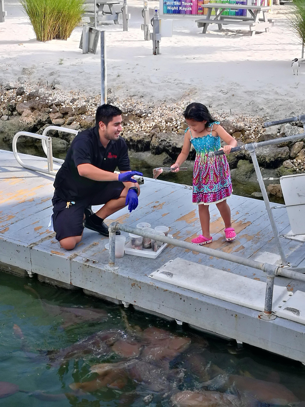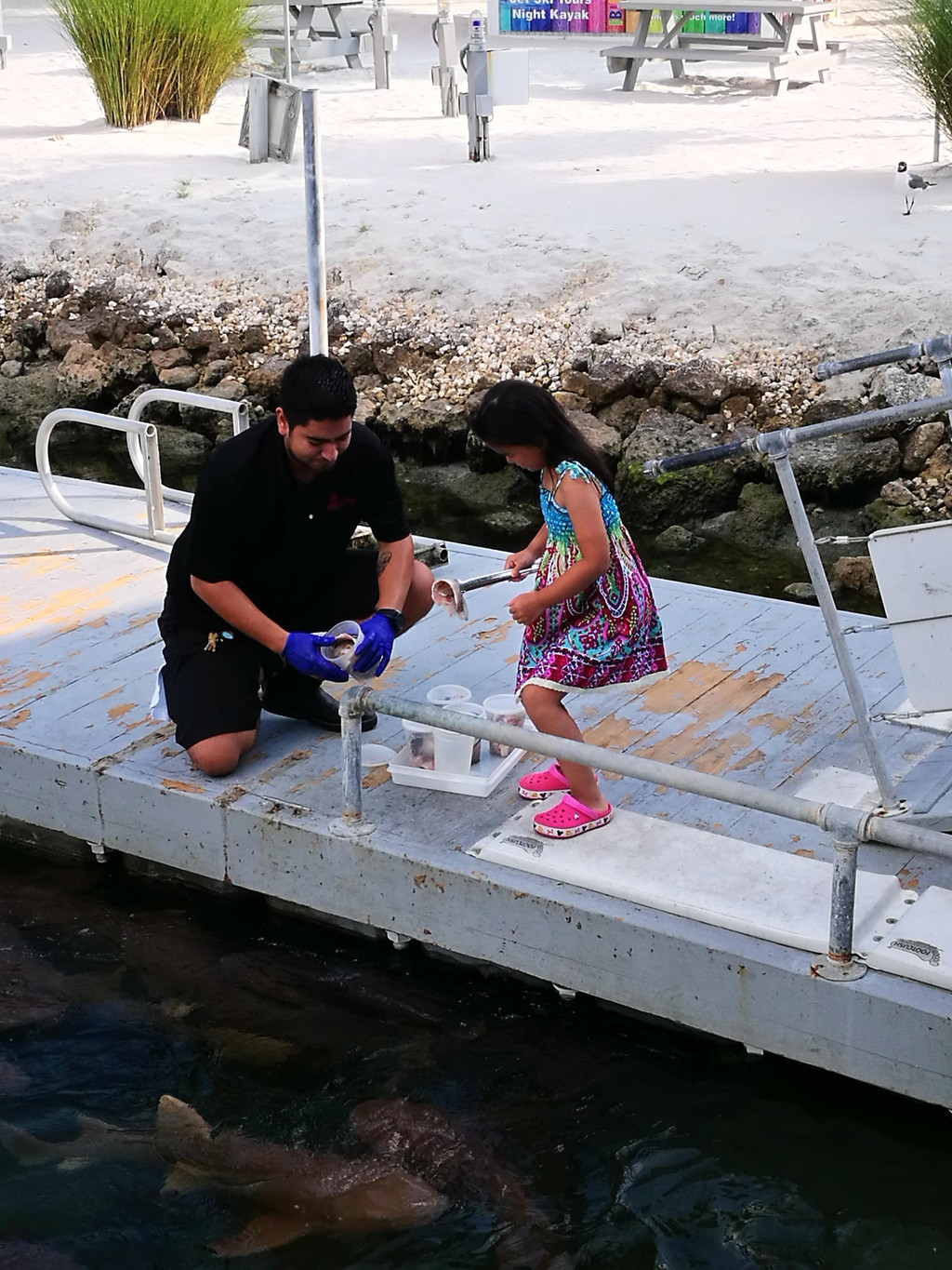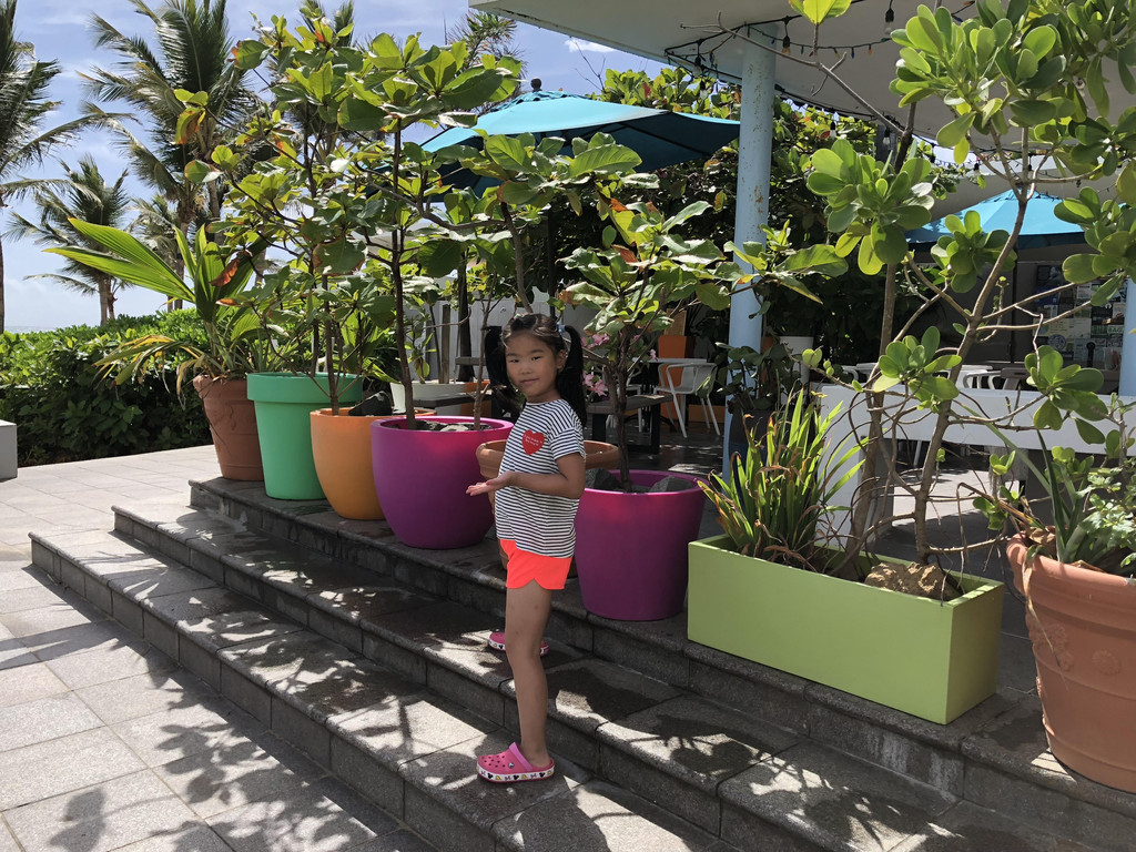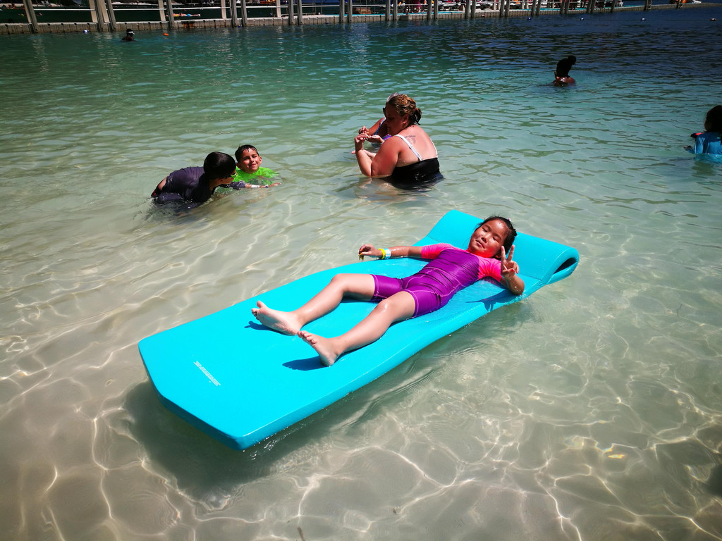 度假的时光总是慢悠悠的,回到酒店,吃个快餐,下个泳池,一晃就到傍晚了。我们住的宜必思酒店有一项活动,在傍晚六点有喂小鲨鱼。我们洗个澡,赶紧到酒店餐厅的甲板上,喂鲨鱼活动已经开始啦,客人们排着队,都跃跃欲试。服务员会给你一把夹子,夹住鱼肉伸到水里,哇,小鲨鱼们全部挤过来,一下子就把夹子上的鱼肉拉走了,力气可大啦!我和萱宝都喂了鲨鱼,萱宝第一下没喂成功,又加喂了一次,嘻嘻。。