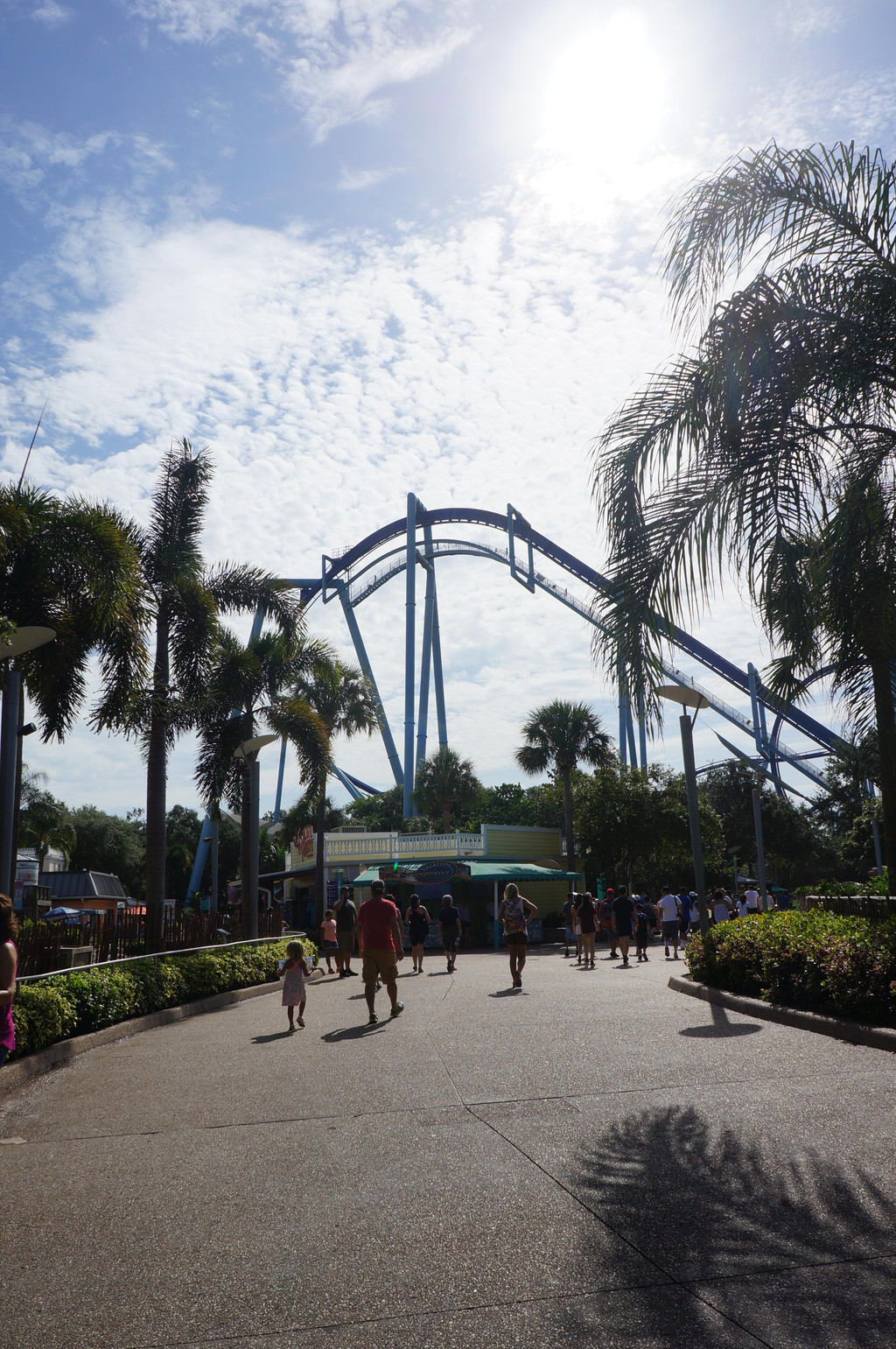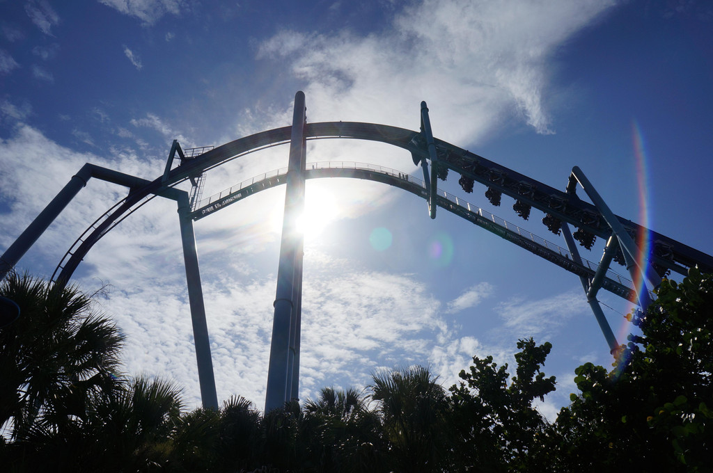 到了SeaWorld,一进门就被腾空而架的过山车轨道震撼到了。看一下地图,发现公园内有三座过山车,名称和造型都是以海洋鱼类为名的。有些轨道接近于垂直角度,有些轨道是360°转圈,还有些轨道直接贴近水面,光看看就觉得吓人。