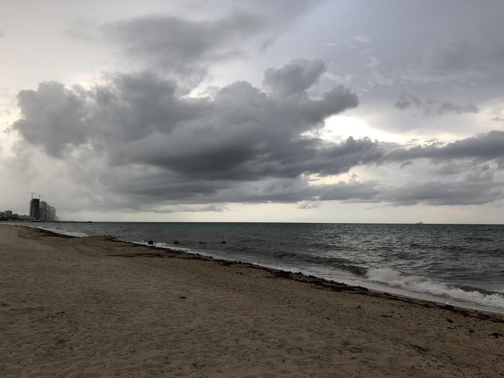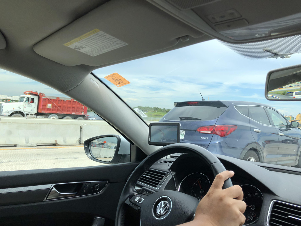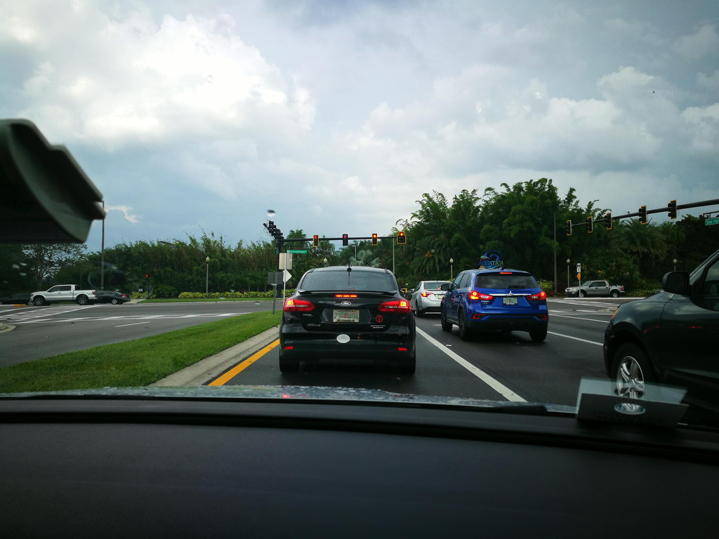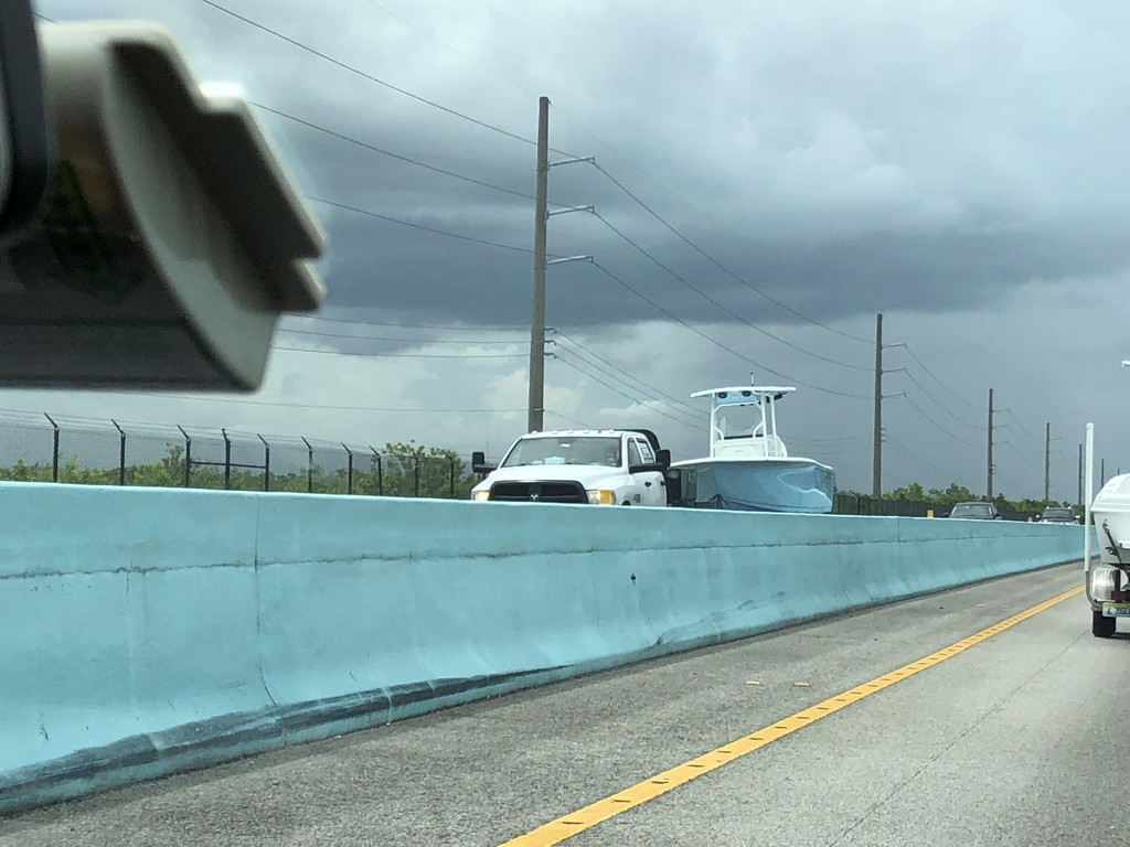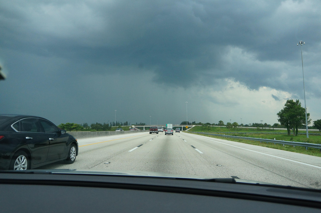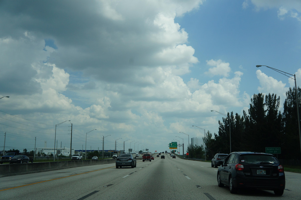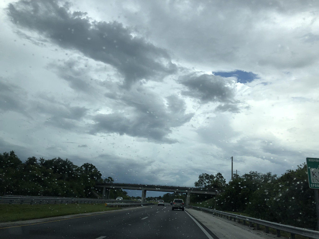 跟着导航,准备开上高速公路,没想到有一个出口出了交通事故,封路了,只能硬着头皮往前开,又碰上了有修路的,导航是离线的,没能及时更新,于是孩子爸爸各种找路,浪费了近一个小时,最后找到了正确的路线。此处,再次给孩子爸爸的镇定和智慧点赞一下!上了高速公路,就方便了,只要方向正确,就可以一直往前开了,沿着高速公路,先要路过迈阿密,迈阿密上空的天气十分多变,一会儿暴雨,一会儿天晴。有几阵暴雨下到雨刮器开到最大档位也看不清前面的路,孩子爸爸只得减速慢行。