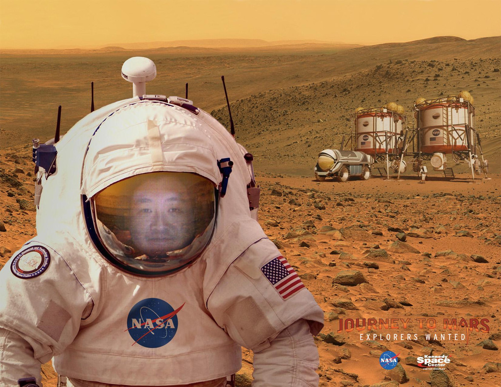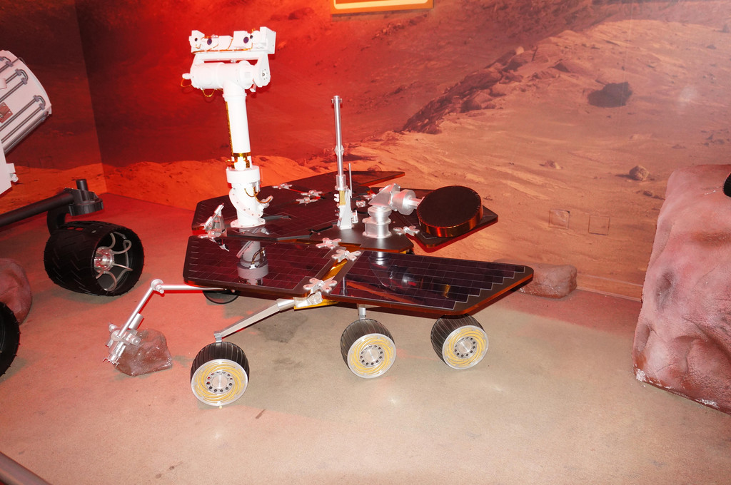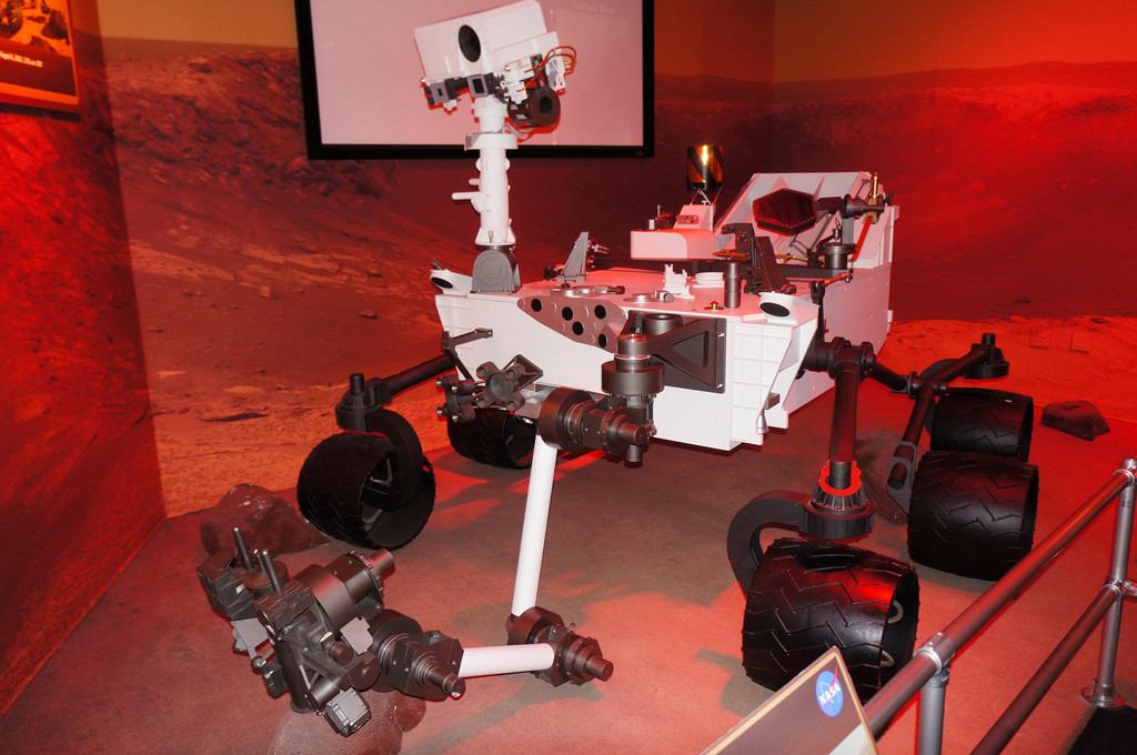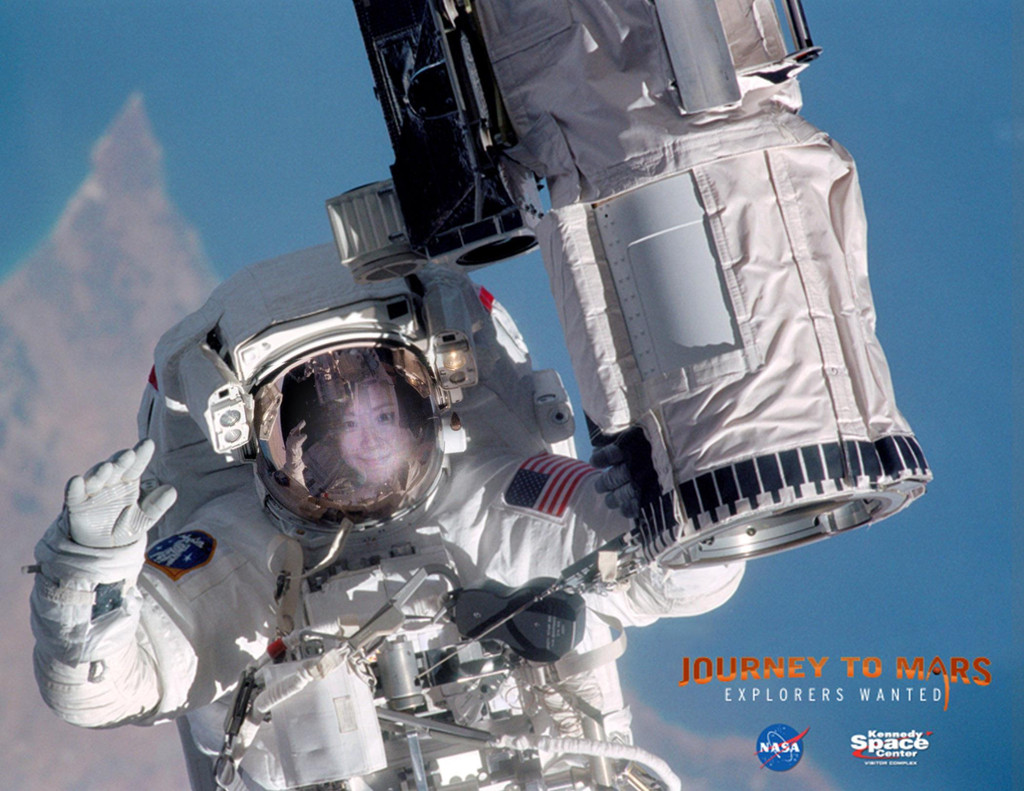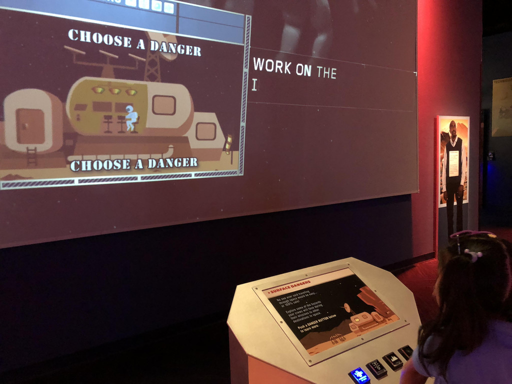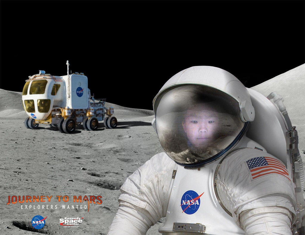 中午以前,我们参观了“火星之旅”馆,里面讲述了美国探索火星的历史,陈列了一些机械臂和超酷的火星车。这个馆比较注重游客的探索,其中有一个区域是互动问答题,游客在屏幕上选择各种火星上会出现的Dangers危险,然后来了解火星探测的危险性。整个界面做得很卡通有趣,深受小朋友们的喜爱,萱就一连玩了好几次。另一个区域是Journey to Mars,游客可以自己选择火星照片,键入邮箱地址,过了一会儿就会收到这封来自Mars的邮件喽。