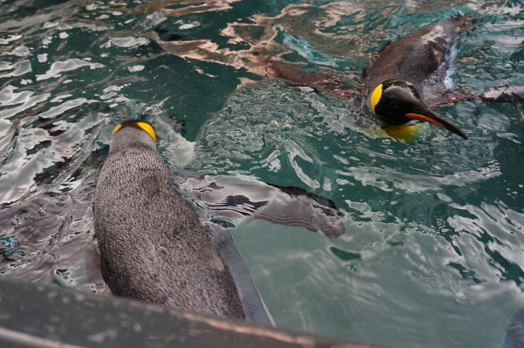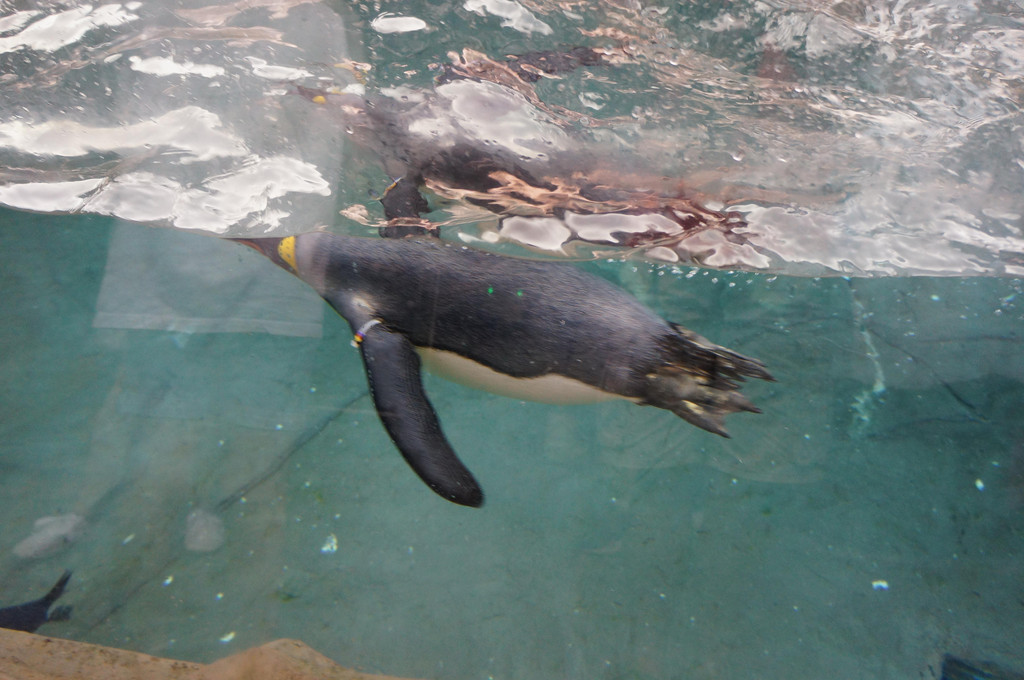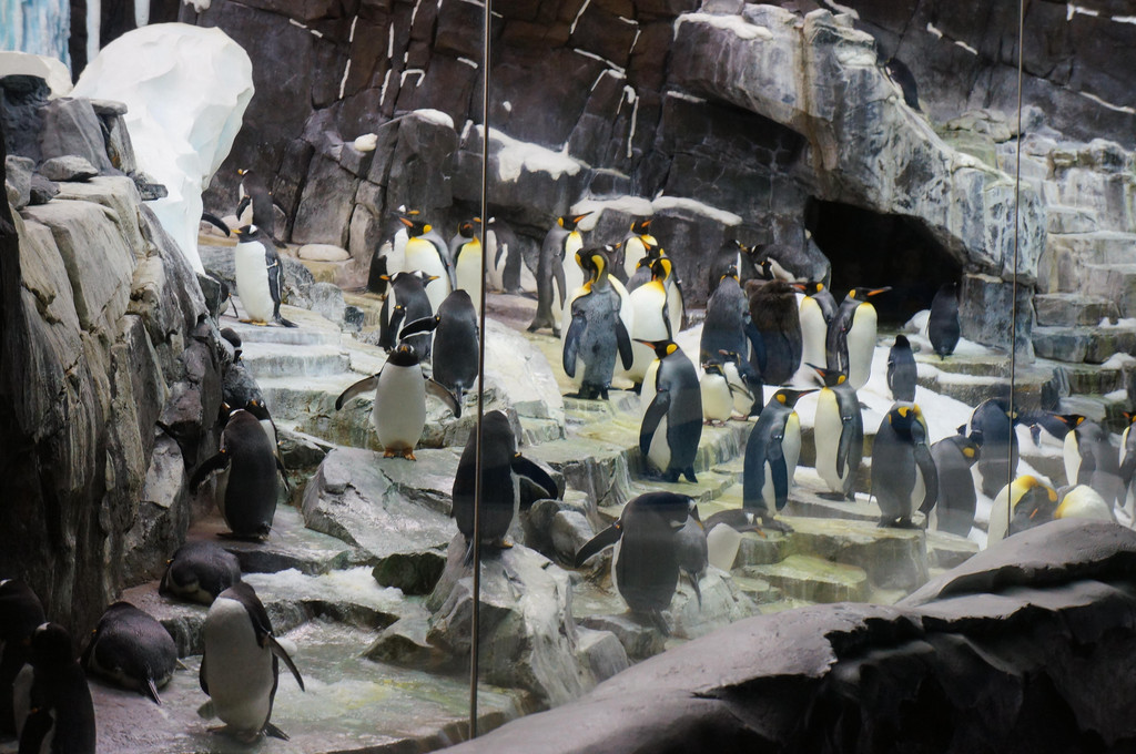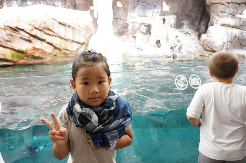 还好雨下了大概一刻钟左右停了,我们也差不多排到企鹅馆里了。想像一下,被雨淋湿的身体,一下子进入冰窖中,是什么感觉?哈哈。。孩子爸爸说冻得吃不消了,后来稍微看了一会儿企鹅就出来了。不过讲真,这里的企鹅好灵活,站在岸上唧唧咋咋的,呼朋唤友,一头扎进水中就飞快地游起来,是我有生以来看过的最灵活的企鹅啦。