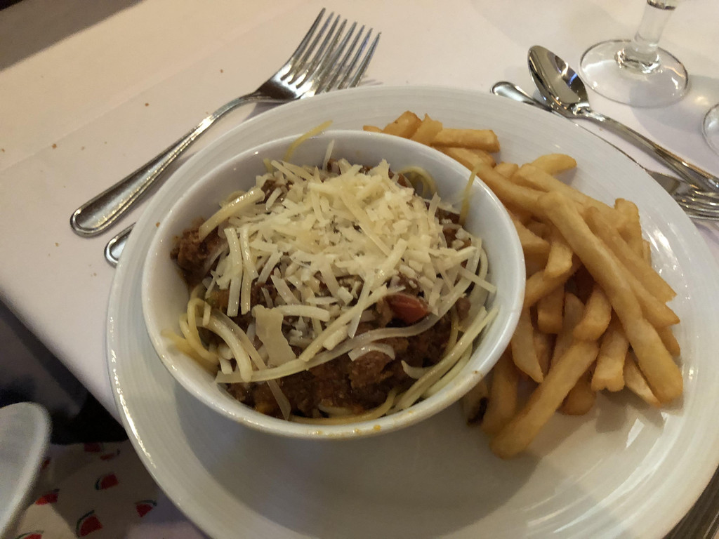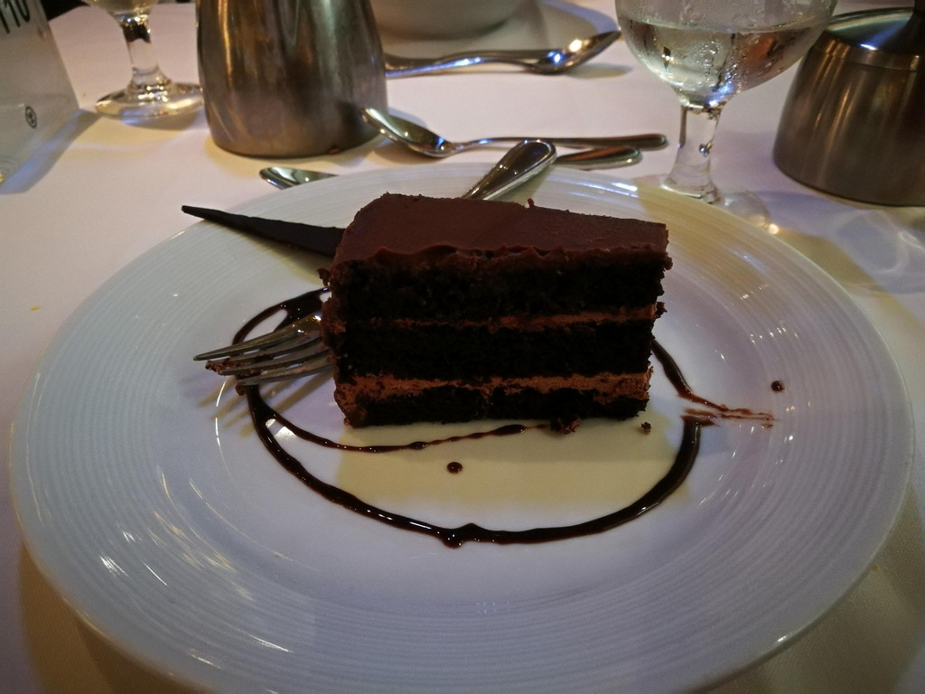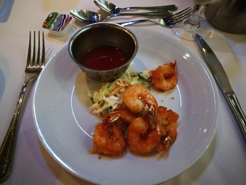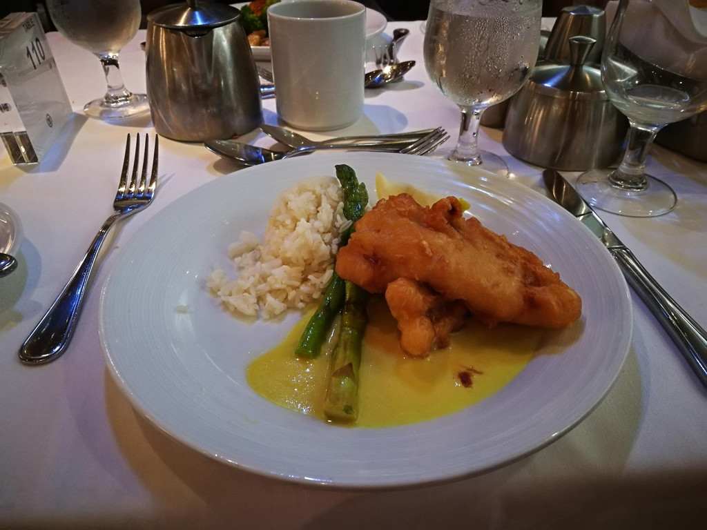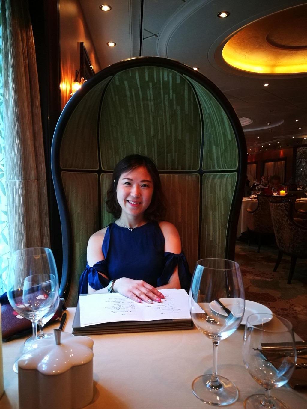 关于晚餐的这家餐厅,是船上的收费餐厅。当时在预定Next cruise时,销售人员就向我们推荐了这家餐厅,说是氛围很好,而且建议我们“两人世界”。进入餐厅,里面的氛围果然十分幽静,灯光暗暗的,私密性比较好,果然适合“两人世界”。