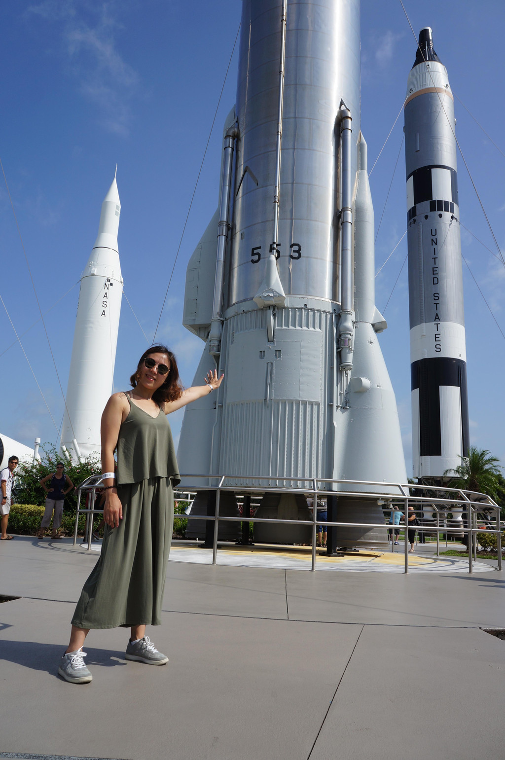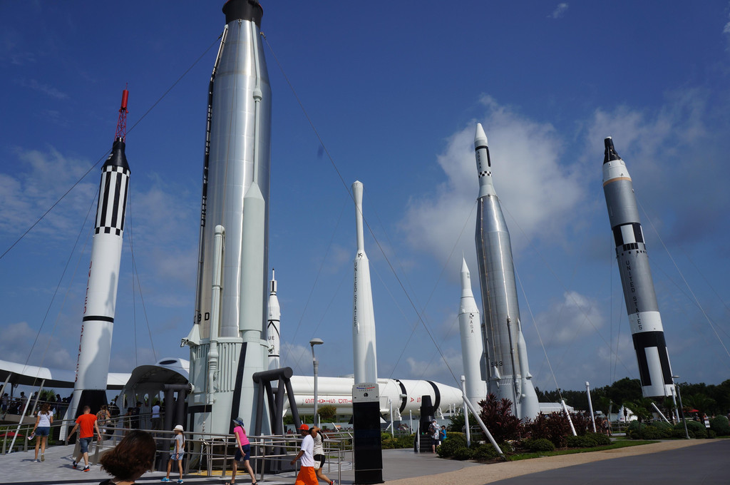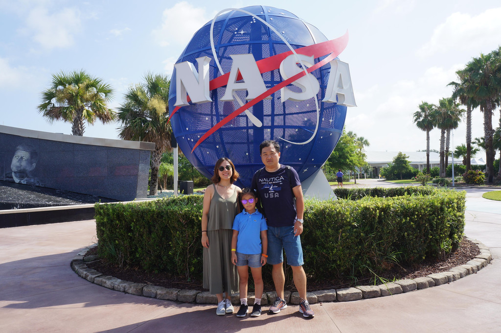 到达肯尼迪航天中心停车场,远远就看到了入口出的火箭广场,一架架火箭高耸入云,我们一下子就兴奋起来,这可是人生中第一次看到那么多真实的火箭啊!在进门处的NASA标志前合影留念后,我们飞奔入园。