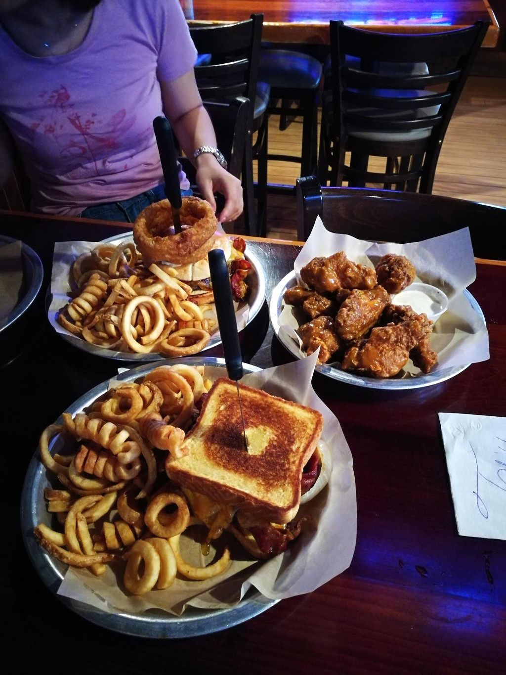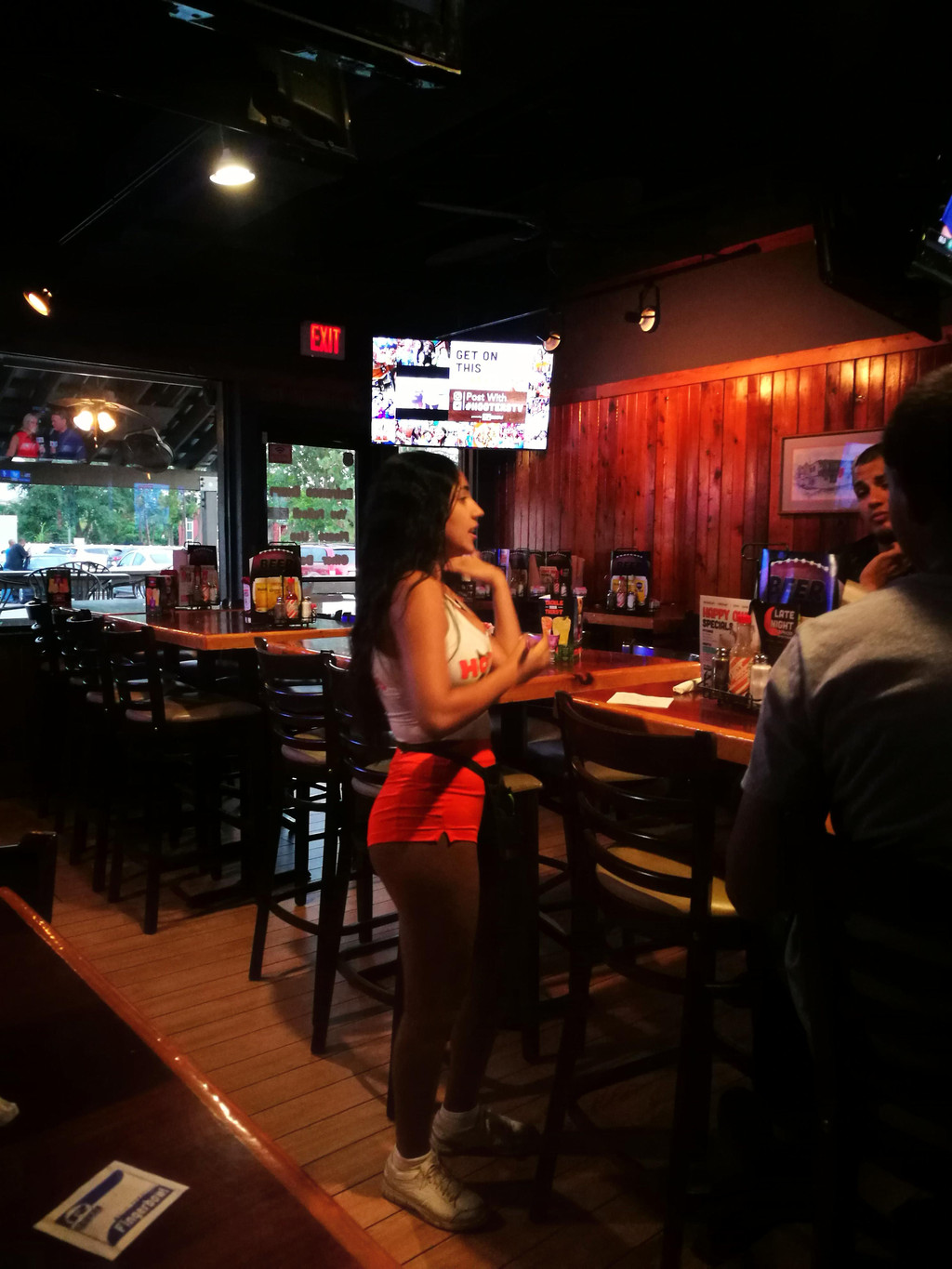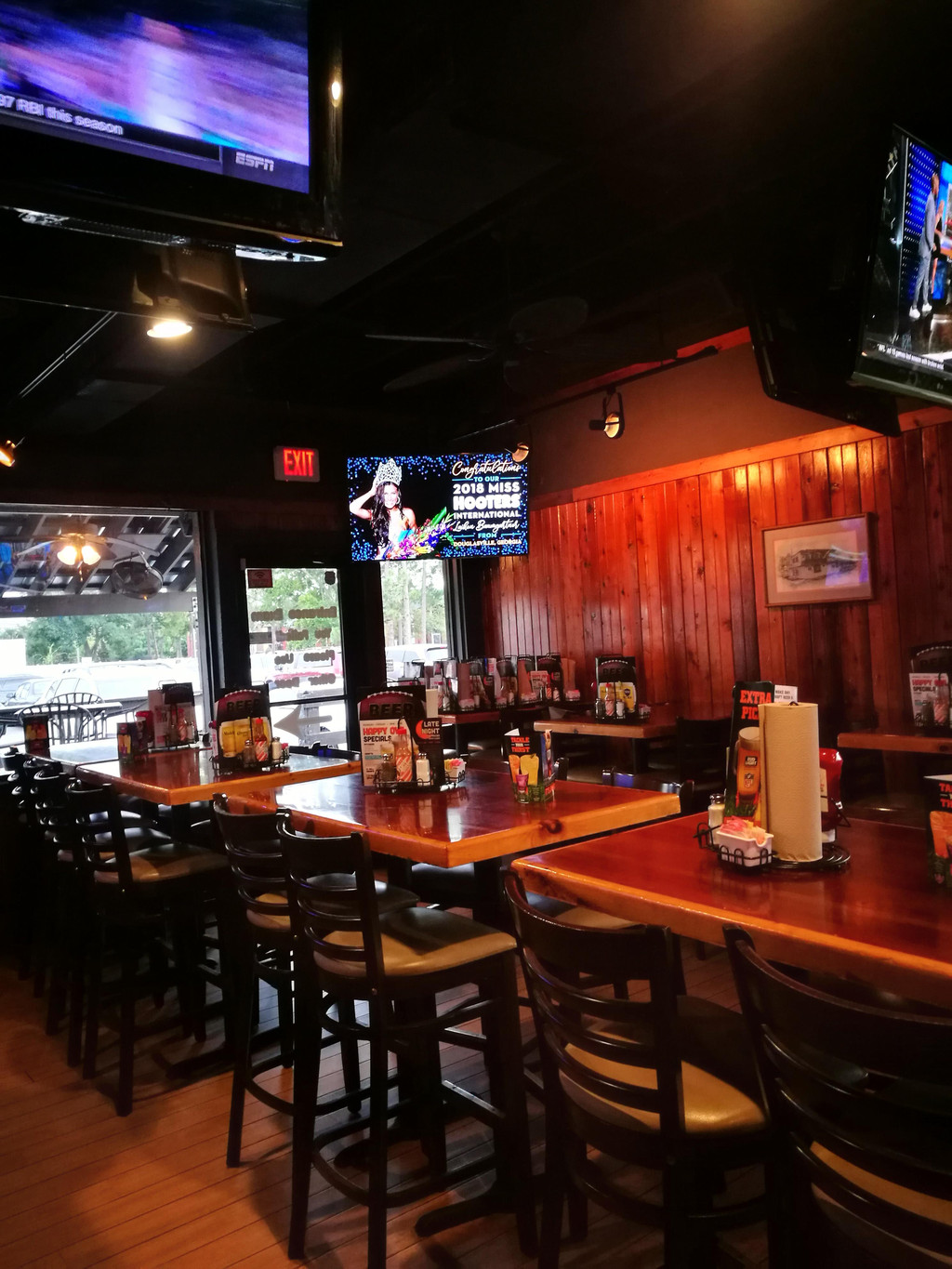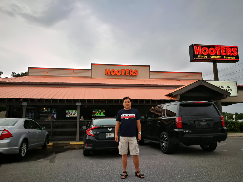 从商店开门,一直血拼到下午四五点,这劲头可真好啊!哈哈,带着满满一个后备箱的败品,我们开车去旅馆附近的Hooters吃完饭。说到这个Hooters,孩子爸爸一直心心念念,以前就说:哪天去美国旅游,一定要去Hooters去吃饭,看里面的服务小姐跳舞。因为上海的猫头鹰餐厅,里面的服务员也是身材火辣,穿着超短裤,热情和顾客互动的。。。