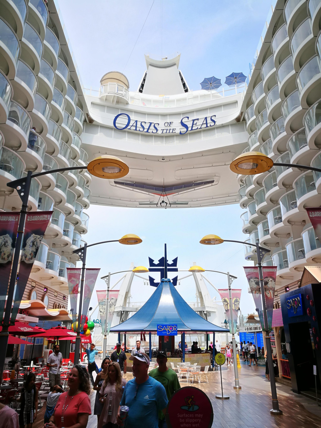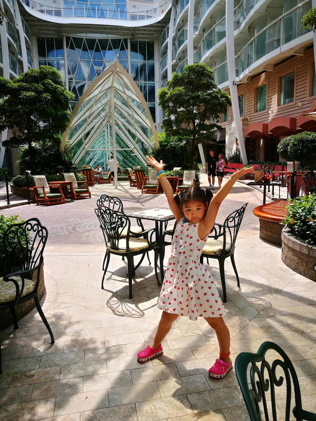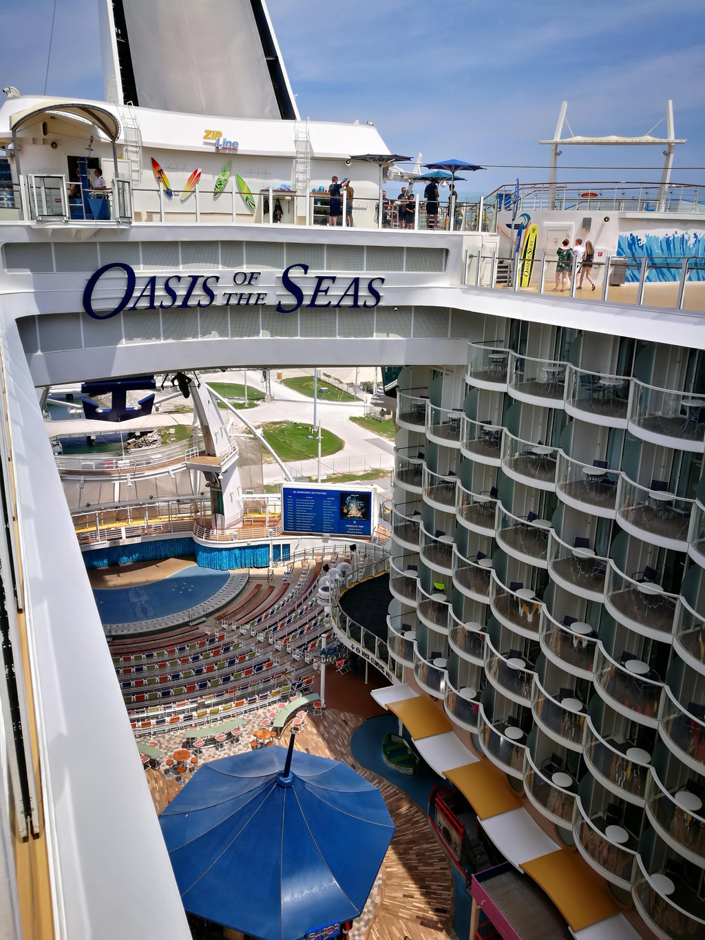 下午两点左右,我们终于进了自己的房间-阳台房,专门打扫我们房间的服务生也来热情地跟我们打招呼了,是一个来自拉丁美洲Guyana奎亚那的小黑。因为行李还没有到,所以我们先去15层的Windjammer风帆餐厅用午餐。我一上船就觉得有点晕船,所以没拿什么吃的,喝了点红茶,最后拿了一块Cheese Cake,却甜得不得了,吃不下去了。用好午餐,我们到各层去逛了逛,熟悉一下环境,以便之后在船上的八天可以“路路通”。14层是运动区域,不少年轻人已经在打篮球和冲浪了,也有不少小朋友在泳池里玩耍了。8层的空中花园是海洋绿洲号的特别之处,种植了各种花花草草和小瀑布,犹如一个热带花园,旁边还有一些高级餐厅和奢饰品店,十分典雅。而5层则是皇家大道,服务中心就在这一层。很多客人在排队办信用卡关联。孩子爸爸行前就在网上办好了关联,所以就不需要现场排队办喽。大道上还有小吃店、酒吧、免税店和品牌商店,匹萨饼店和甜品店都是可以免费拿取点心和咖啡啥的,非常适合晚上玩得晚了吃夜宵。差不多到了4点开船的时间,要去甲板上集中,进行逃生演习。我们的逃生演习地点是6层的Aqua Theatre,屏幕上播放了船长的讲话录像,船上要注意事项的卡通片,还有一个仿照007谍战片风格的安全事项小电影。其实这些也就是走个流程,大概半个小时的时间,结束后大家就各自回房间,理理行李准备去吃晚餐了吧。