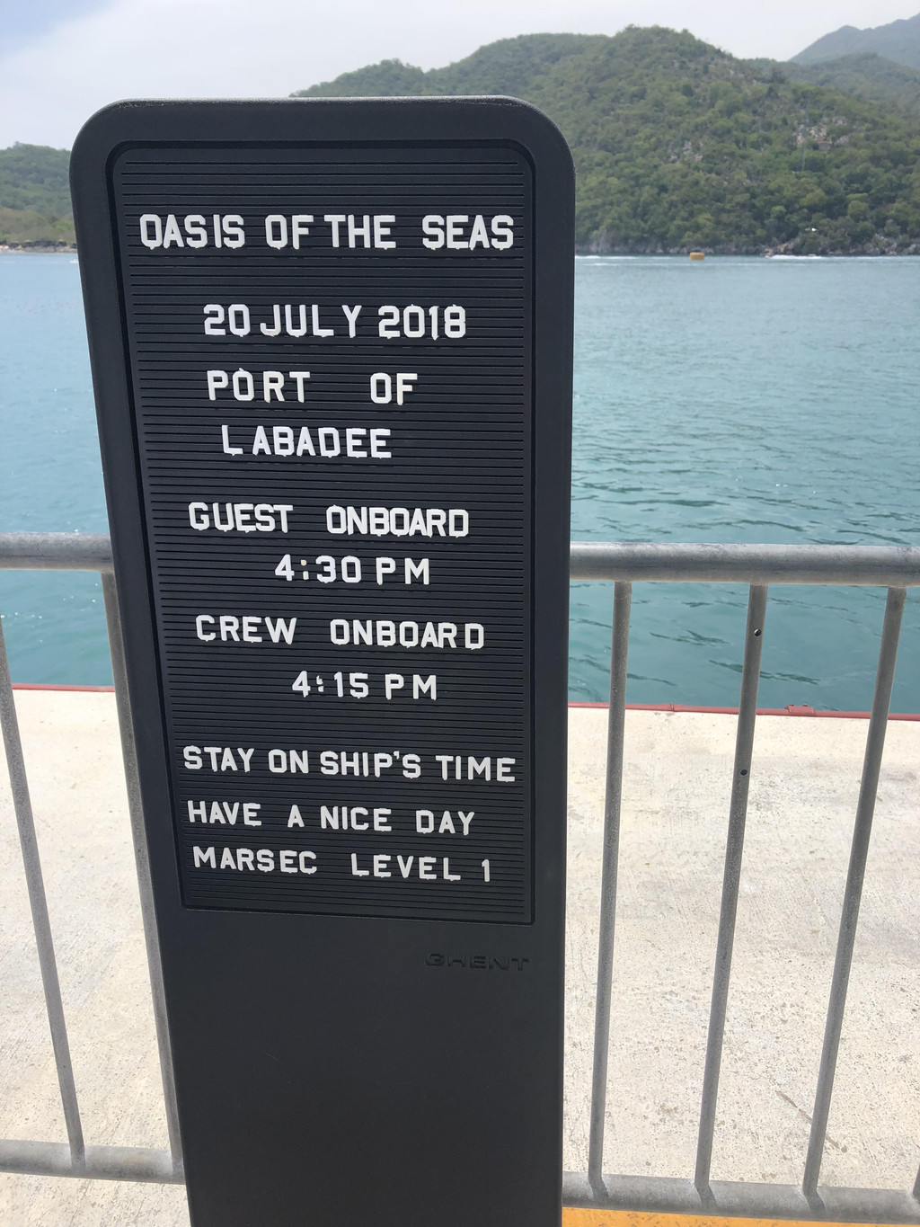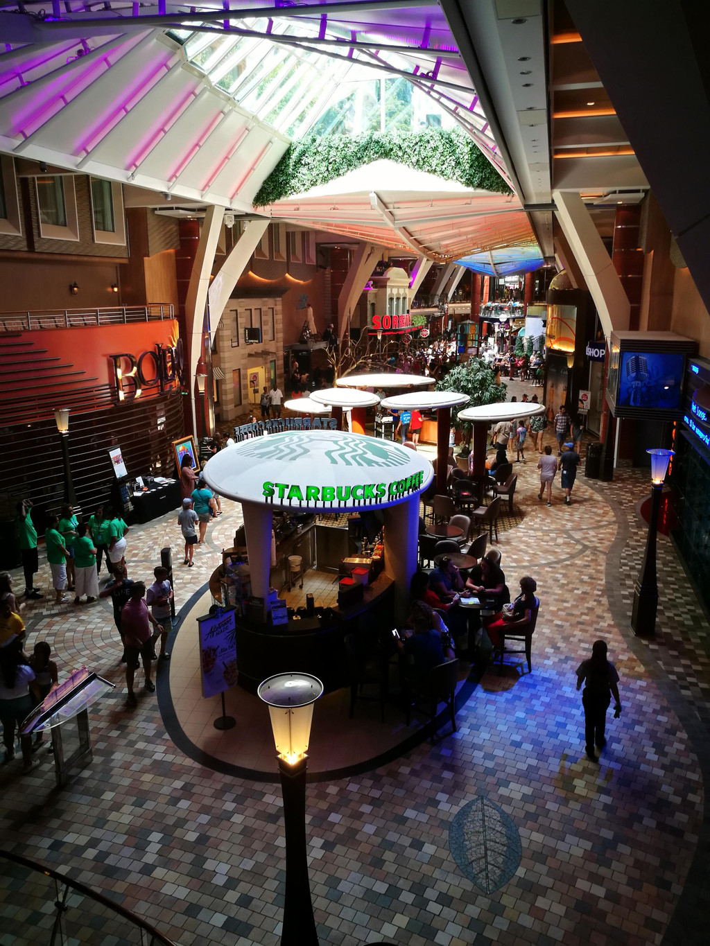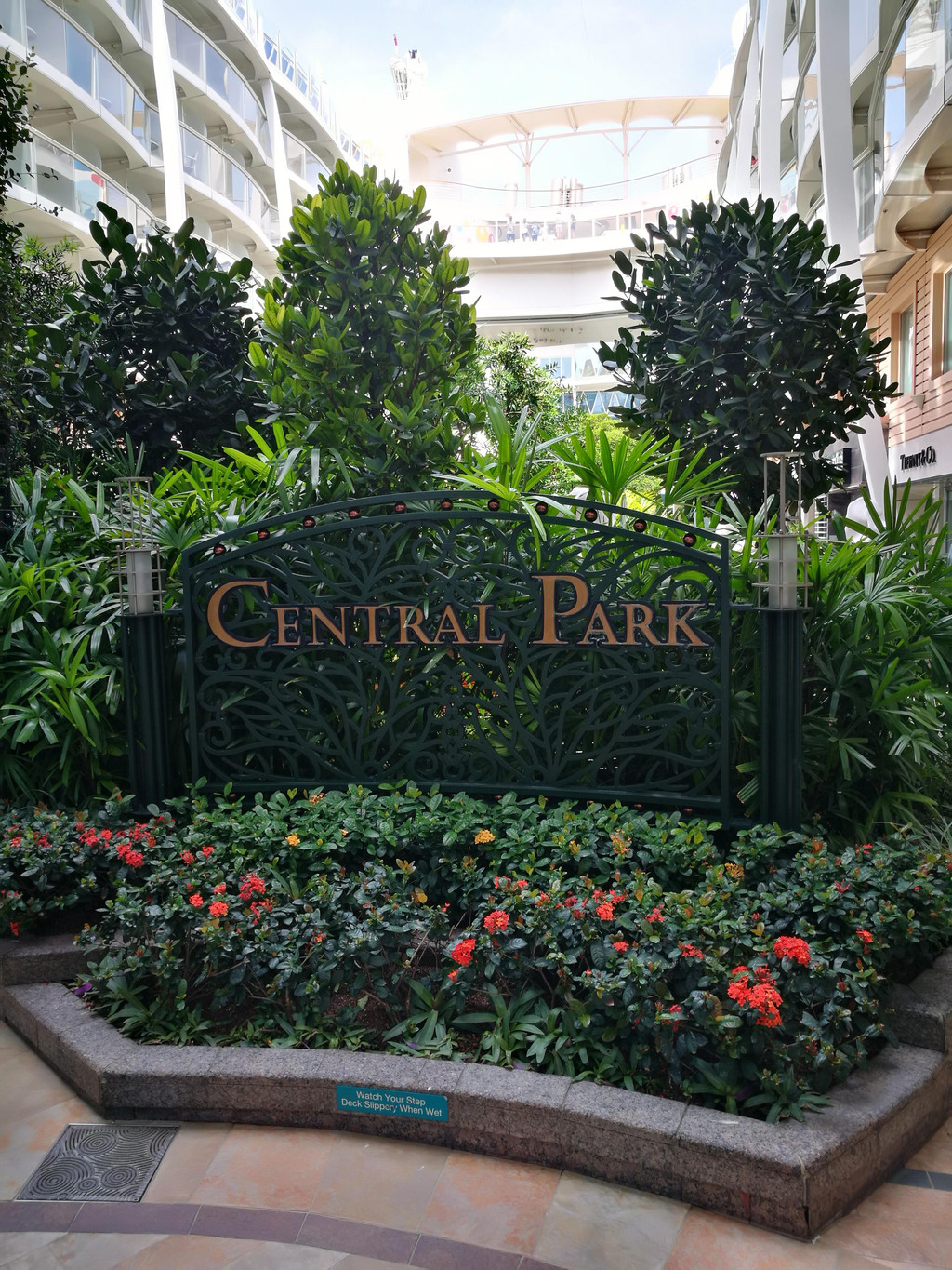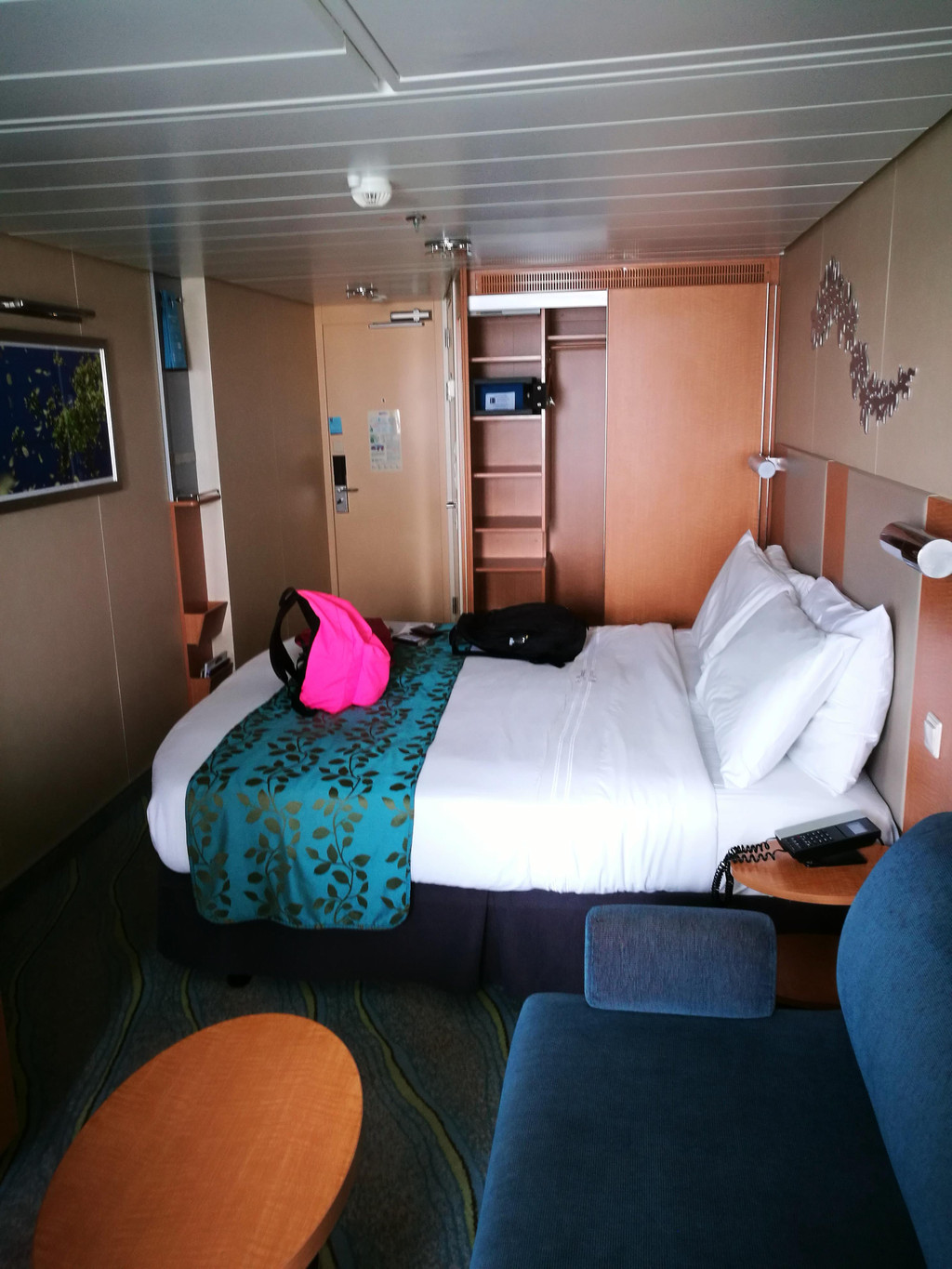 下午两点左右,我们终于进了自己的房间-阳台房,专门打扫我们房间的服务生也来热情地跟我们打招呼了,是一个来自拉丁美洲Guyana奎亚那的小黑。因为行李还没有到,所以我们先去15层的Windjammer风帆餐厅用午餐。我一上船就觉得有点晕船,所以没拿什么吃的,喝了点红茶,最后拿了一块Cheese Cake,却甜得不得了,吃不下去了。用好午餐,我们到各层去逛了逛,熟悉一下环境,以便之后在船上的八天可以“路路通”。14层是运动区域,不少年轻人已经在打篮球和冲浪了,也有不少小朋友在泳池里玩耍了。8层的空中花园是海洋绿洲号的特别之处,种植了各种花花草草和小瀑布,犹如一个热带花园,旁边还有一些高级餐厅和奢饰品店,十分典雅。而5层则是皇家大道,服务中心就在这一层。很多客人在排队办信用卡关联。孩子爸爸行前就在网上办好了关联,所以就不需要现场排队办喽。大道上还有小吃店、酒吧、免税店和品牌商店,匹萨饼店和甜品店都是可以免费拿取点心和咖啡啥的,非常适合晚上玩得晚了吃夜宵。差不多到了4点开船的时间,要去甲板上集中,进行逃生演习。我们的逃生演习地点是6层的Aqua Theatre,屏幕上播放了船长的讲话录像,船上要注意事项的卡通片,还有一个仿照007谍战片风格的安全事项小电影。其实这些也就是走个流程,大概半个小时的时间,结束后大家就各自回房间,理理行李准备去吃晚餐了吧。