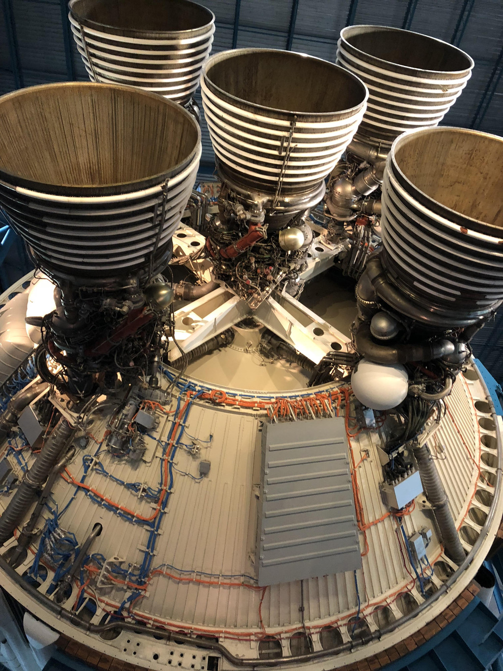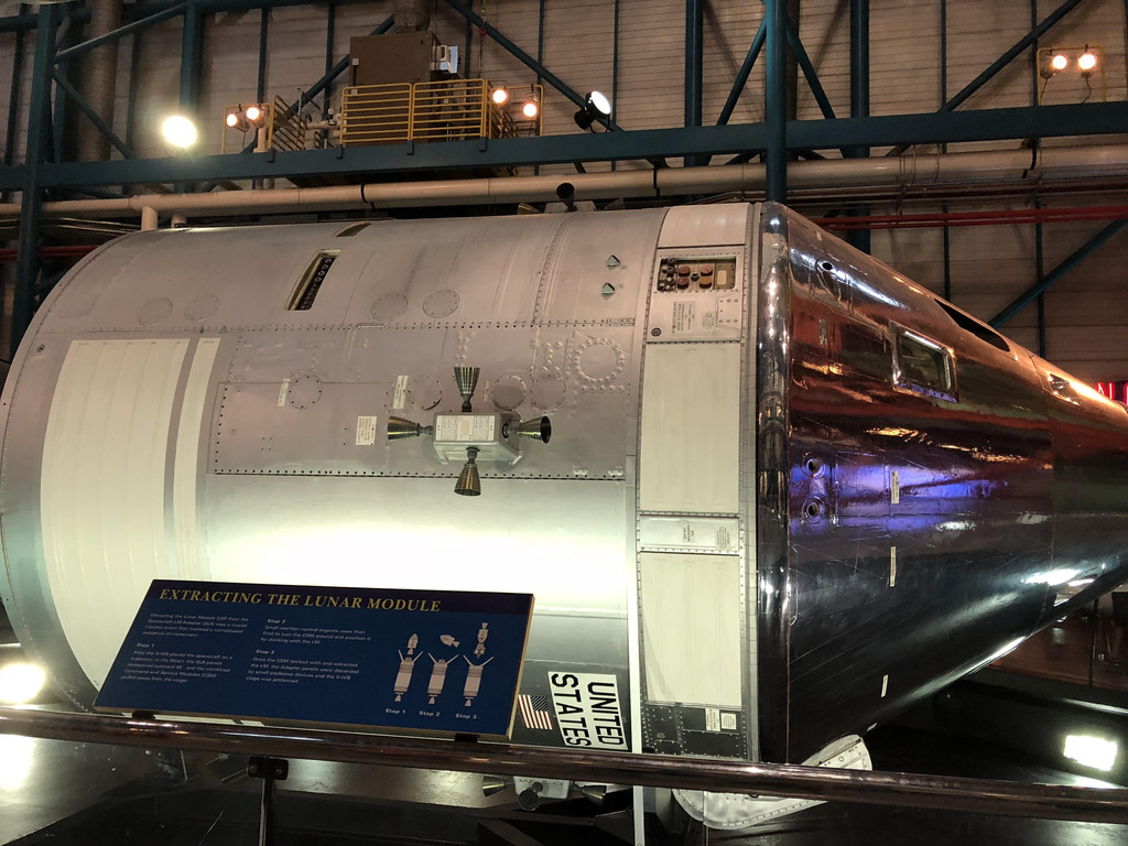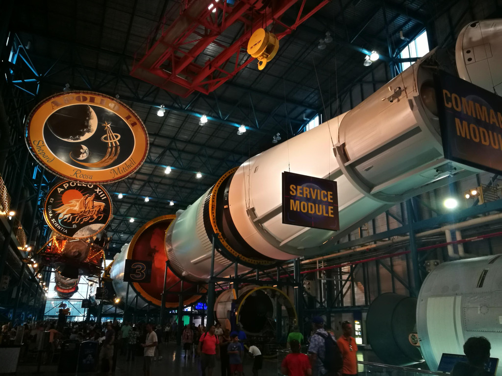 接着,巴士把我们送往航天体验中心,零距离观赏火箭和飞船。先是阿波罗计划中的“功臣”土星五号火箭中心,展示了土星五号火箭及其部件,这些大家伙就横卧在我们的头顶,虽然我不懂火箭的工作原理,但是我能感受到这里见证着美国人乃至人类航天历史上的伟大进步。