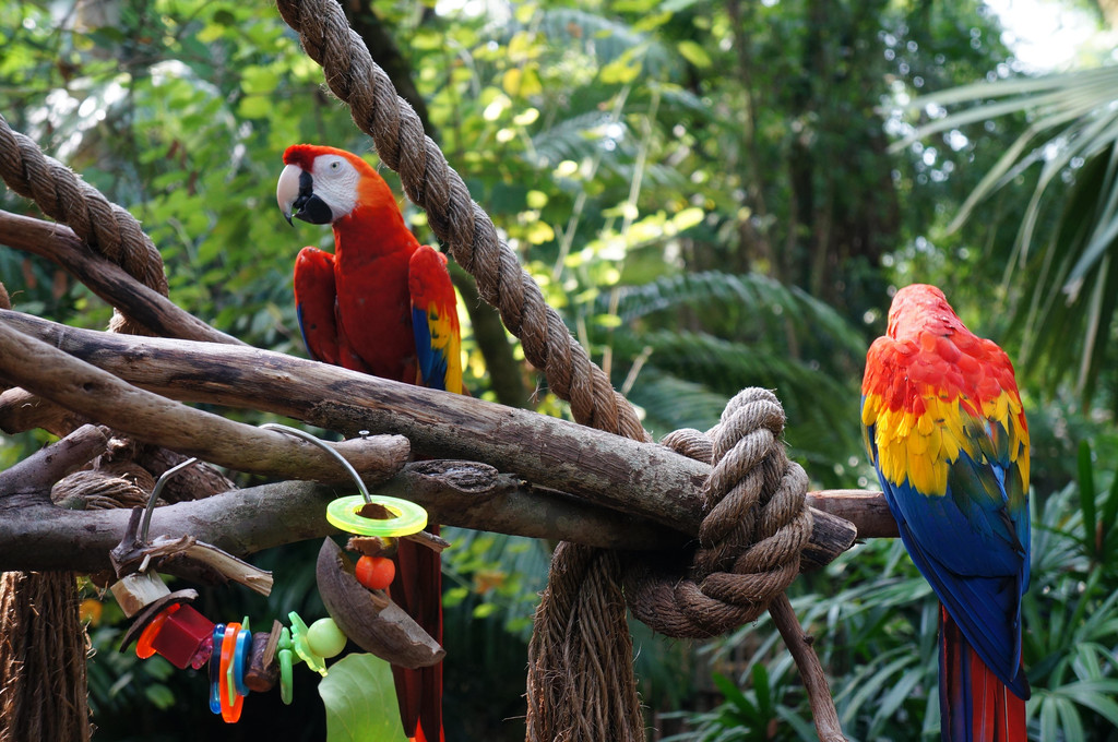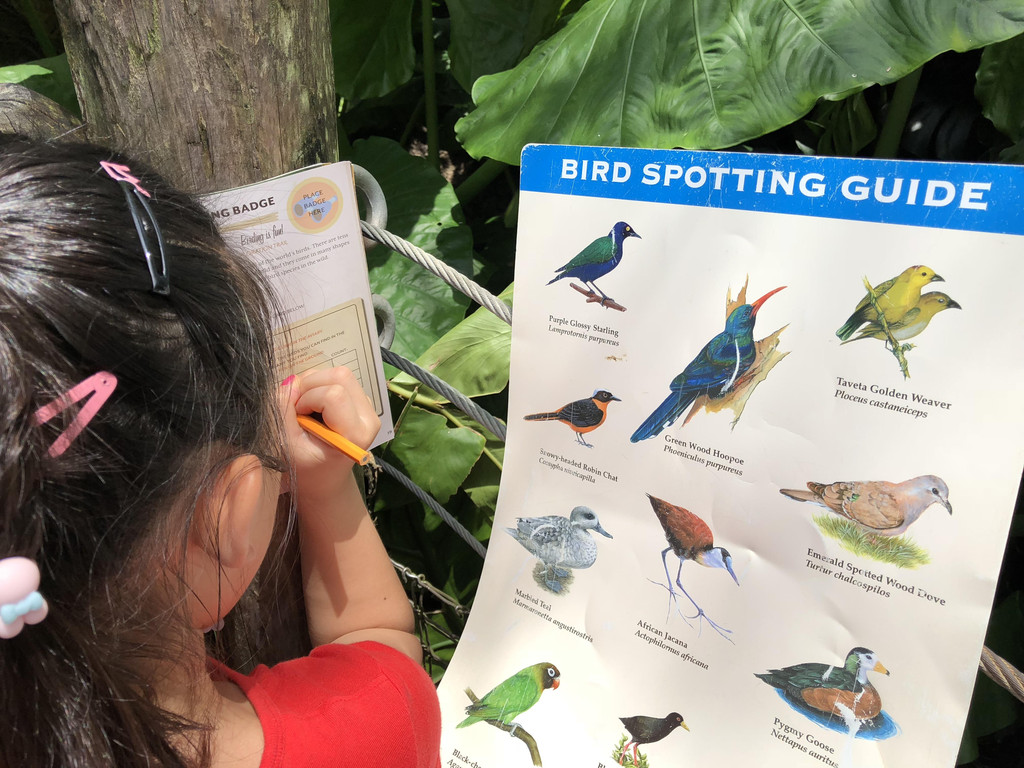 先来说说乐园里的动物。在乐园的进门处,会有一处小亭子,叫做Wilderness Explorer就,顾名思义就是:野外探险家。小朋友可以在里面拿类似于完成任务的册子,拿着这本册子,到相应的动物园区,会有相关工作人员给出任务,要孩子查阅提供的资料或者仔细观看动物而得到答案,然后工作人员会发给一枚贴纸贴在册子上,当然,册子上集到的贴纸越多越好喽。比如,在火烈鸟园区,工作人员会让小朋友寻找给定的一只火烈鸟,并介绍火烈鸟的身体特点。比如,在鸟舍,小朋友要根据一份鸟类图册,在鸟舍内找到至少三种以上的鸟,写下鸟的名字,并介绍给工作人员。比如,在老虎区域,工作人员会给小朋友看各种动物的爪印,让小朋友找出哪一个是老虎的爪印,等等。个人感觉,这种活动非常有意义,让小朋友在观赏动物的时候,能够学到一些知识,而且绝对不像国内学校里搞的一些活动,走走过场而已。然而,每次我家的娃在完成任务的时候,我心里都很毛。因为这种任务中会涉及很多专业的英语单词,我家娃倒也不管三七二十一,冲上去就和人家工作人员交流,管他听得懂听不懂。据娃事后和我说,听不懂的地方,她就装傻,反正点头就对了。不过,这种“牛头不对马嘴”的英语,娃倒也都蒙混过关了。(当然,妈妈我也在一旁做了一些翻译工作啦。)