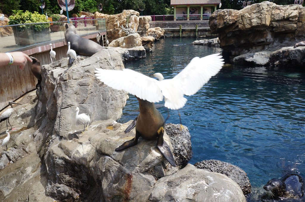 下午我们还去海豹池看了海豹,现场可以买鱼喂海豹。这些海豹看来是和人呆久了,竟会连连向游客嗷叫要食物。当游客向它们投食鱼时,海豹头一伸,就把鱼给吞进了肚子。池子周围还停着许多白色的大鸟,它们时刻盯着这些食物,猝不及防就来抢夺,看着海豹和大鸟抢夺食物,真是太有意思了!