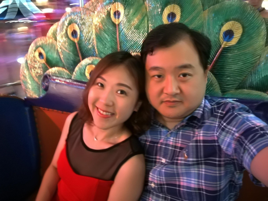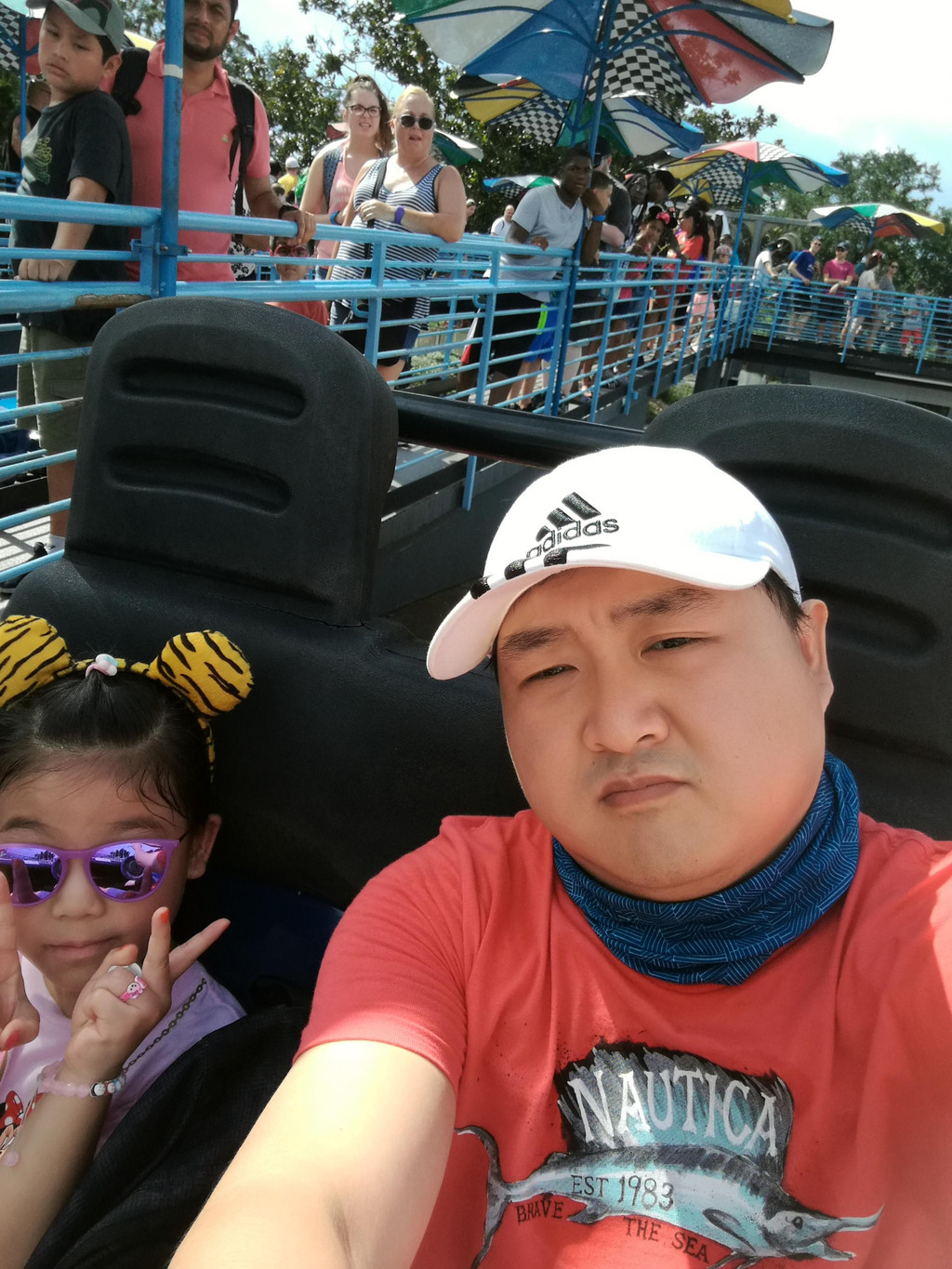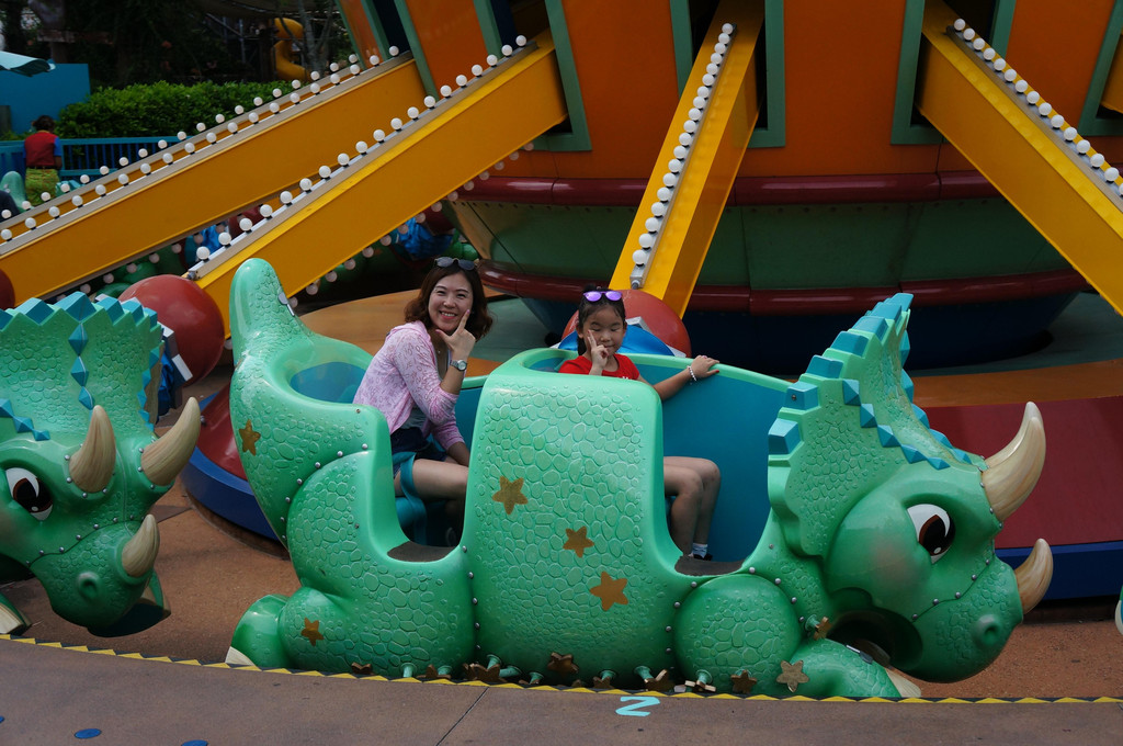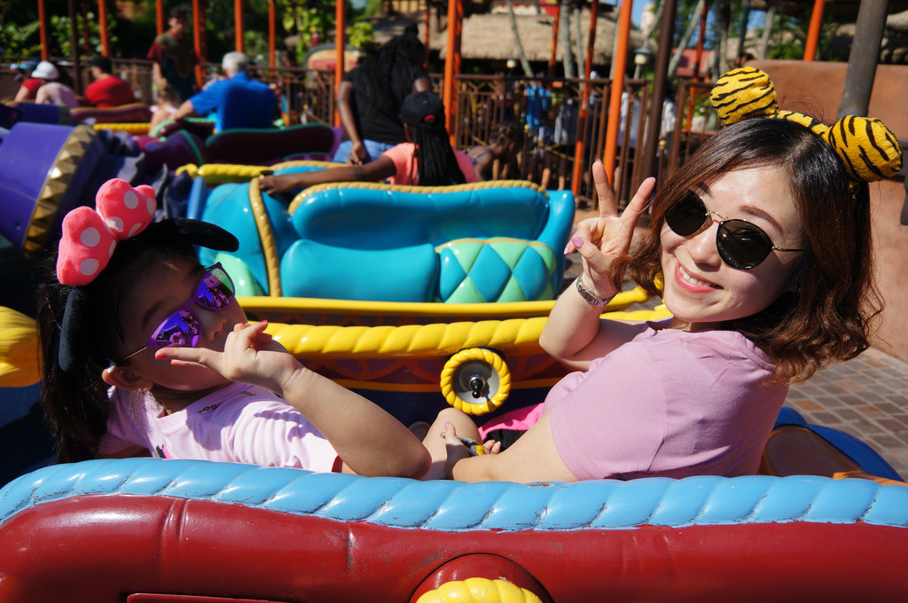 精彩的花车巡游结束以后,我们又重新回到乐园里面,玩Tomorrow Speedway,也就是有轨道的赛车。这个项目玩好以后,我就伤掉了,感觉是乐园里比较坑的项目,真不知道为什么还有那么多人排队玩。首先,整个场地里都是赛车的发动机轰鸣的声音和排放的烟雾,在炎热的天气下,就更觉得热了。其次,赛车的设置就好像玩具汽车一样,只有一个踏脚板,踩下去就是油门,松开就自然减速和停止。而且,方向盘只能转两圈的,不像真正的汽车,方向盘是转三圈的。所以碰到转弯,方向盘只需要转动一点点即可。我哪里知道,所以一到转弯的地方就弯转得特别大。最后,赛车的两边轮子之间是有一根铁轨隔开的,所以像我这种弯转得特别大的人,只要一动方向盘,两边轮子就会撞上当中的铁轨。所以整个行程我开得好慢好慢,旁边几根道的车子都超过我了,而我家孩子爸爸那辆车,已经老早在终点站等我了。好吧,我发誓,以后再也不玩这个项目了。