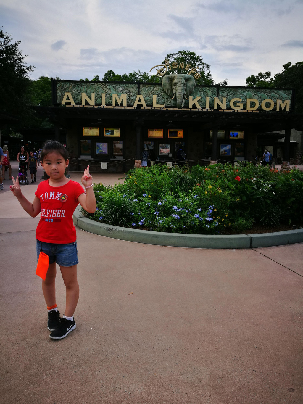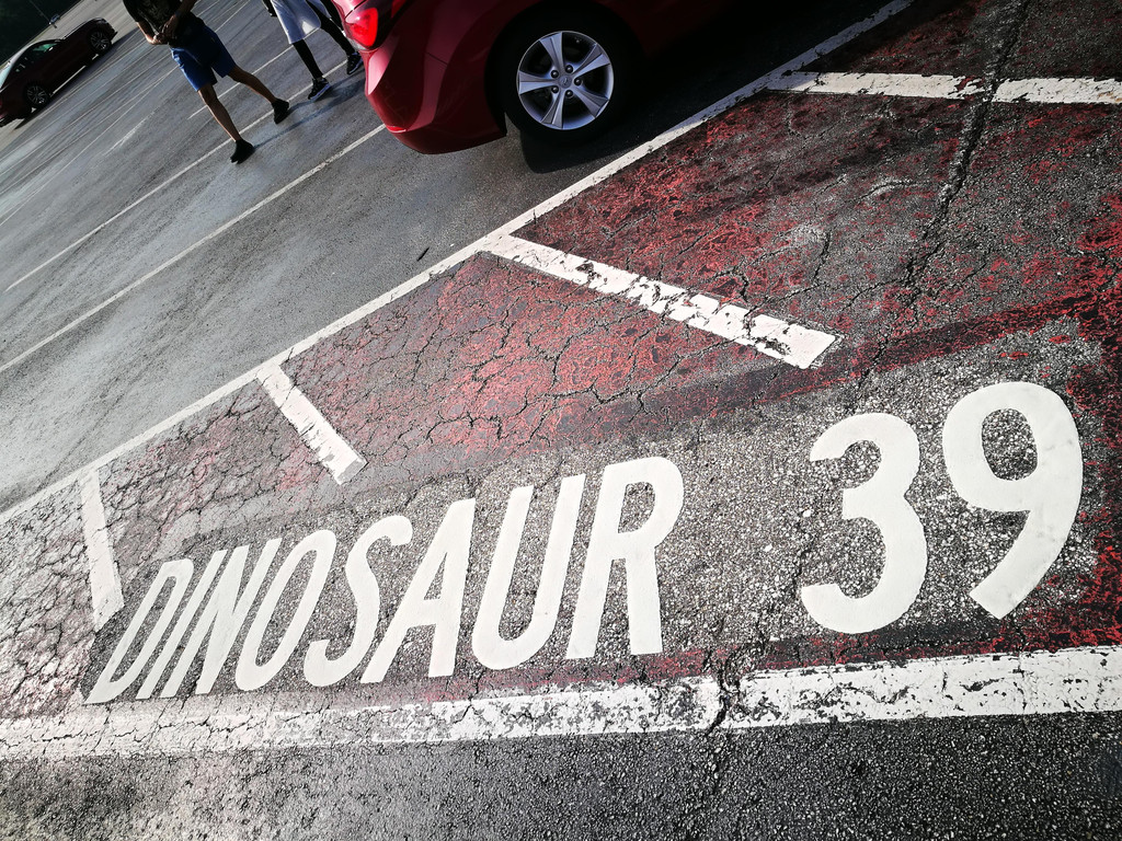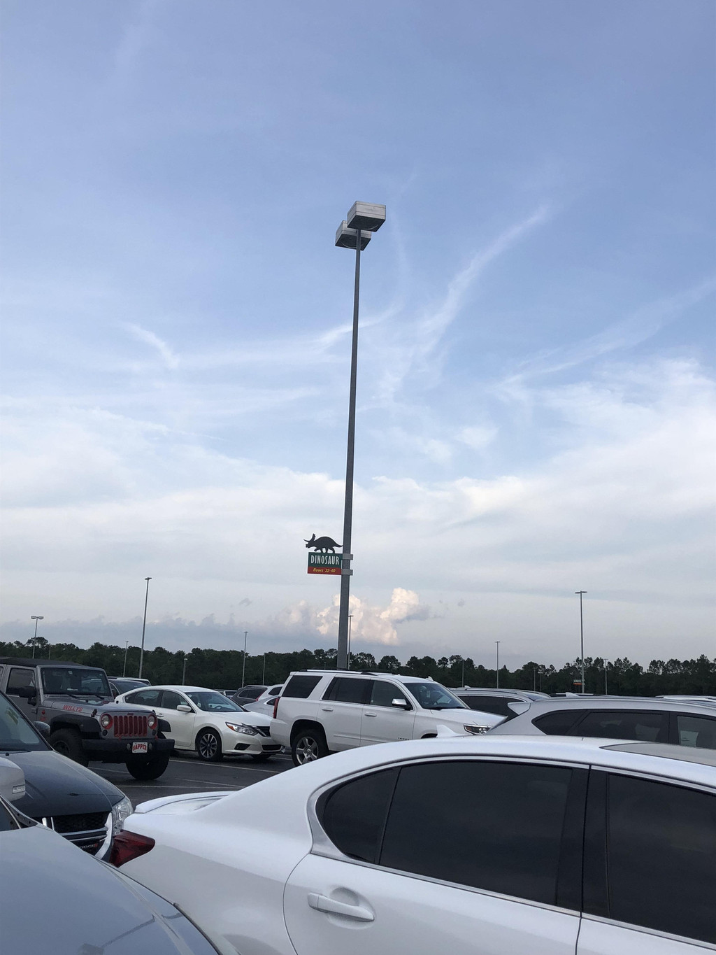 上午九点超过,我们车子进入了停车场。吸取昨天的教训,我们下车第一件事就是记住自己停车的区域,还拍了照以防遗忘。昨天的Magic Kingdom停车场是以迪斯尼人物为名,而今天的Animal Kingdom停车场则是以动物为名,我们停的是Dinosaur区域,标志是一只三角龙。