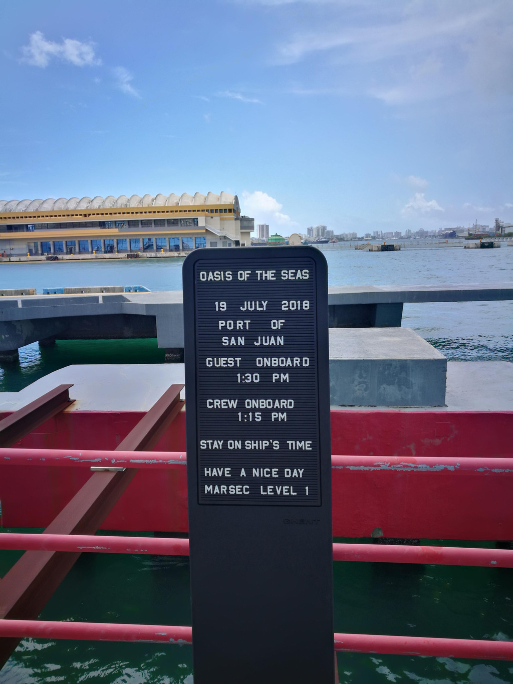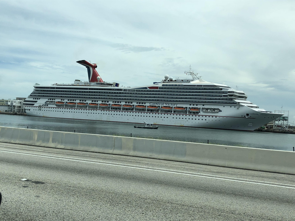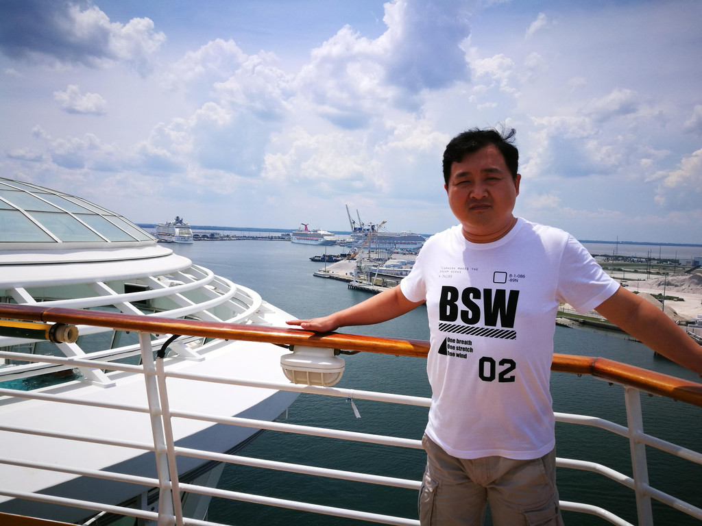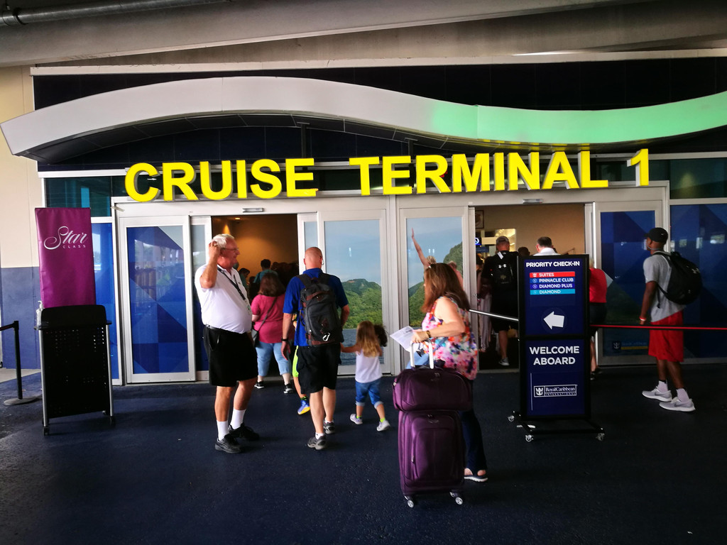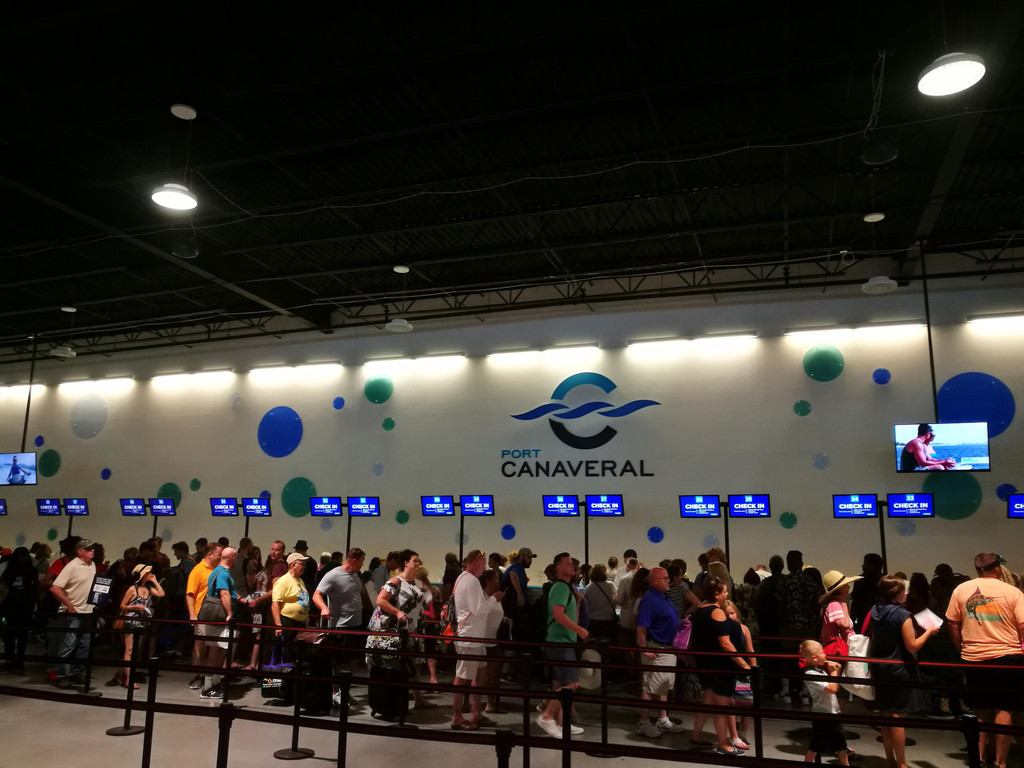 我们开了四天的迈锐宝今天要还掉了,先到邮轮所停靠的港口Cape Canaveral卡纳维拉尔角Budget点还车,然后乘坐租车公司的Shuttle Bus到邮轮码头Port Canaveral卡纳维拉尔港。一路上远远的就看到皇家加勒比邮轮和嘉年华邮轮停靠在码头,等待着客人们开启一段难忘的旅程。Shuttle Bus把我们放到托运行李的地方,已经有工作人员在为客人们搬运行李了。我们也是,将两个行李箱给了工作人员,当然还付了五美金小费,然后到登船处去排队了。