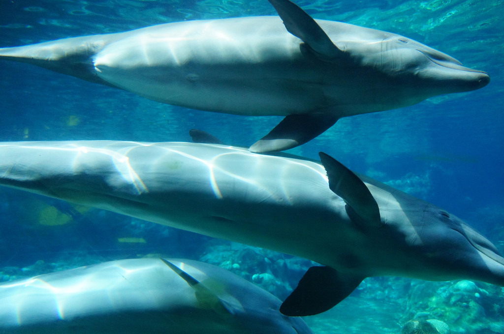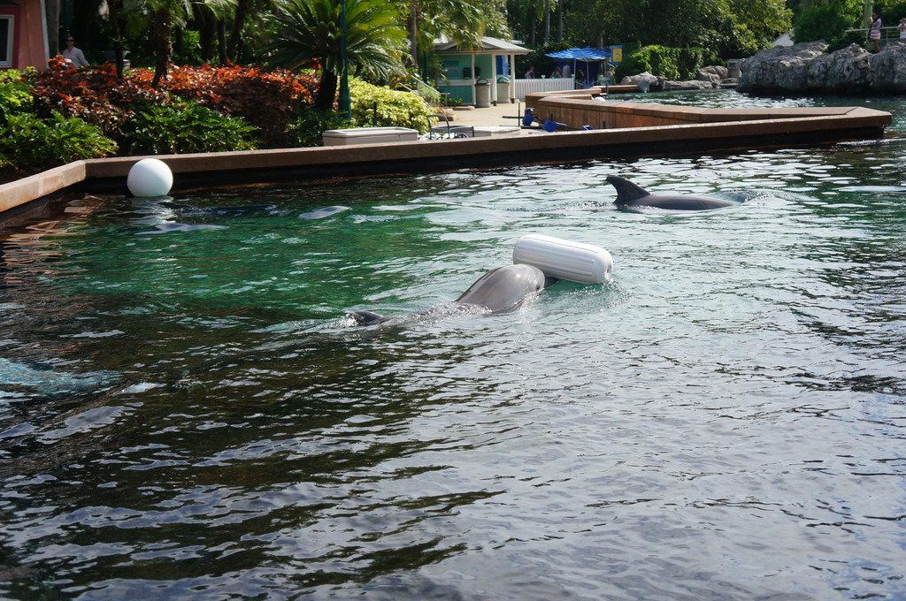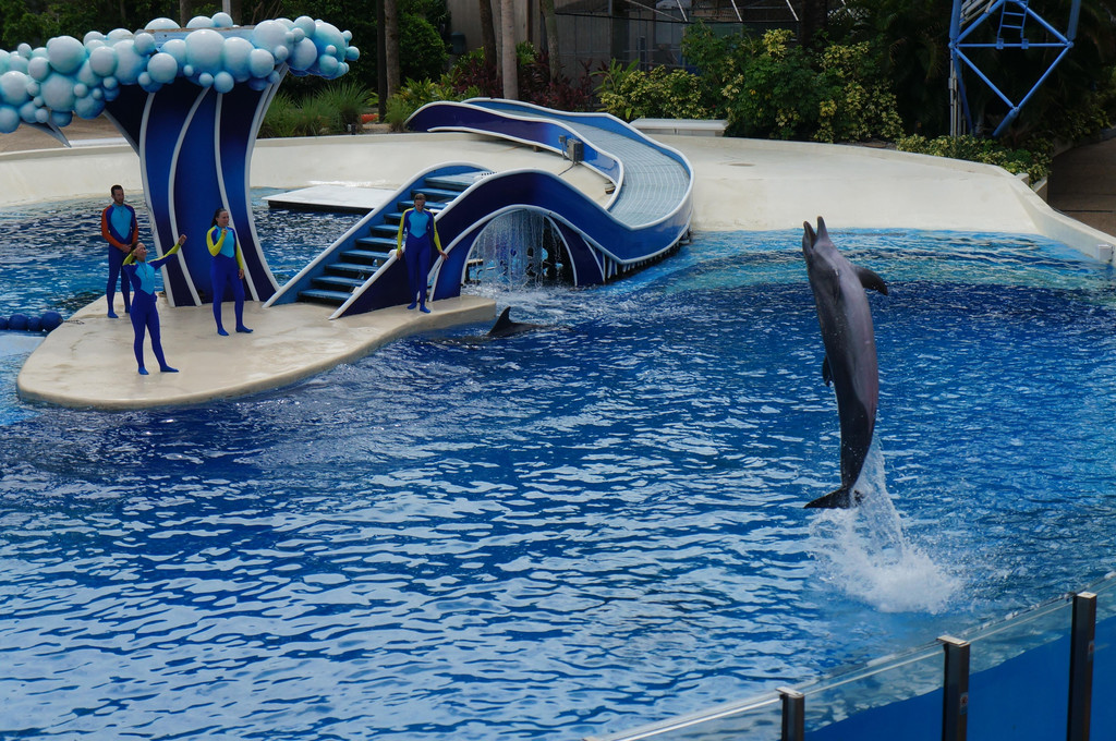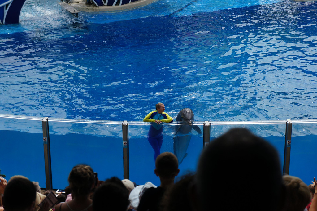 接着,我们来到了训练海豚的池子,这里有意思的是,训练员训练海豚是随时开放的,也就是一些常规训练,比如扔东西让海豚去捡。训练员一边训练海豚,一边和游客们介绍如何训练海豚,还会让游客来亲身体验一下喂海豚。看完海豚训练,我们移步到海豚池的底下,从水底角度来观赏海豚的游动。