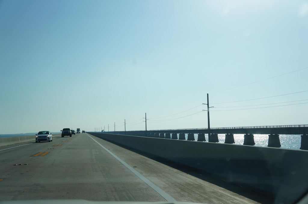 大概在1号公路的一半左右,我们经过了七英里桥,这是一座已经废弃的铁路桥,在上世纪中叶,经过两次飓风袭击,这座桥已经不堪重负,当中有好几段还是断裂的。而我们开的则是后来建造的新七英里桥,在新桥上开车驶过,旁边是刻满岁月年轮的老桥相伴,而前方依旧是无尽的道路和茫茫的大海,一种逍遥的心情油然而生。外国人也真是奇怪,既然不用了还放在那里,也不知道拆掉!是不是拆桥还要花钱,浪费钱啊!
