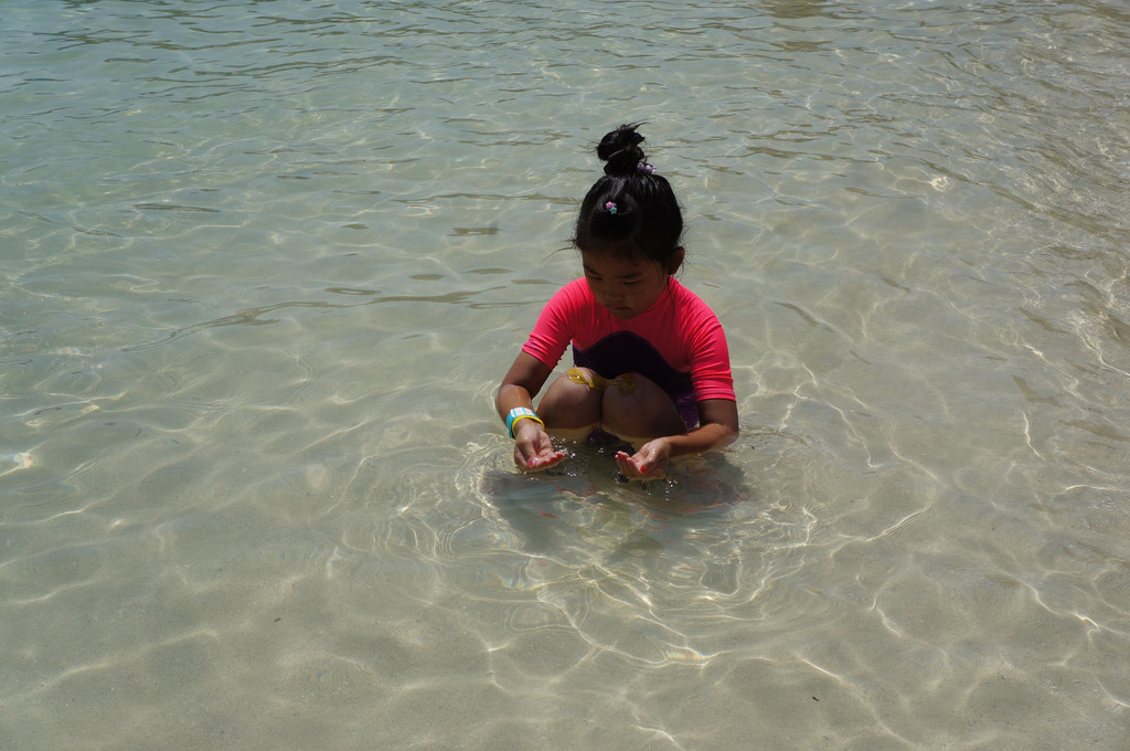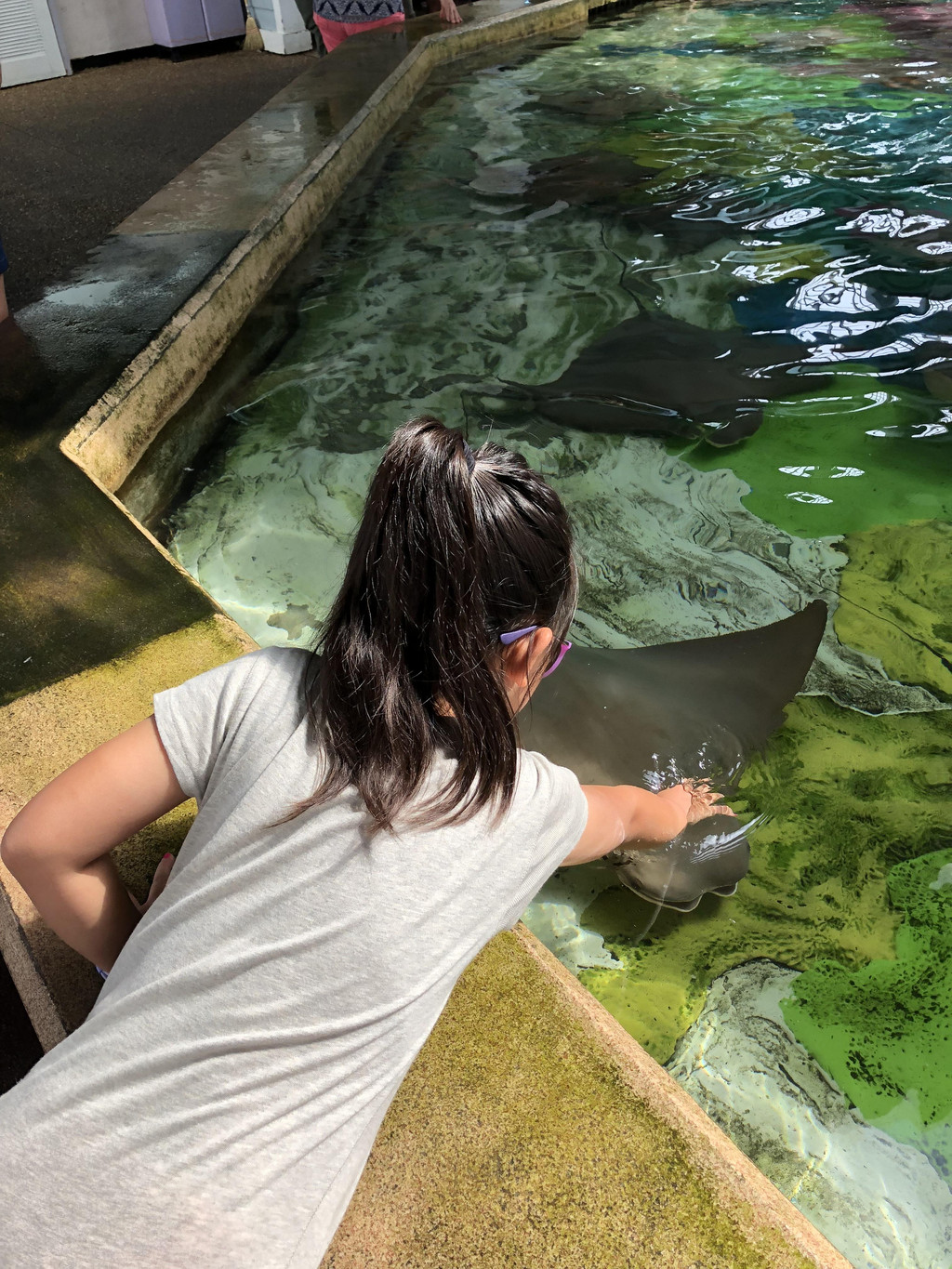来到SeaWorld,当然主要是看海洋动物喽。我们先来到了魟鱼池,就是那种身旁好像长了大大的“翅膀”,还有一根长长尖尖的尾巴,在水里游动的鱼类。虽然在国内也看到过这种鱼,但是从来没有摸过,而这里的池子随便可以伸手摸鱼,萱宝兴奋得不得了,一条接一条地摸过去,衣服前面湿了一大滩。好在是7月份的大热天,湿了也无大碍。