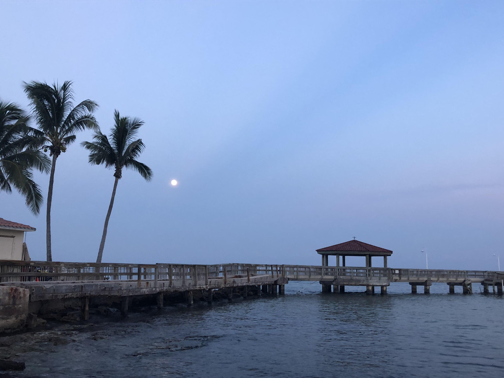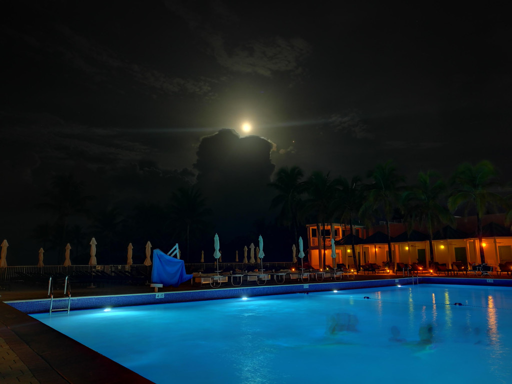 这家酒店的游泳池水很深,别说萱宝了,就连我们大人都踩不到底。没想到,萱却游得自在极了,一会儿下潜,一会儿往前游,还和我们一起比赛游泳,有趣得不得了。泳池里也有一些南美长相的人在游泳,有几个小孩子直接从池边往水里跳,胆子好大。萱也学着他们的样子,从池边的台阶处往池子里跳,哈哈,又get一项新技能啦!这个游泳池独特的地方在于:使用的是海水,咸咸的。水中还有很多沉淀的石灰,石灰粉会随着水波轻轻碰触我们的皮肤,就好像在海中游泳一样。孩子爸爸游了一会儿,就躺到躺椅上啦。今晚的月光十分明亮,天上的云朵有大又立体,月亮在云朵后面时隐时现,孩子爸爸赶紧用照相机记录下这样的美景。
