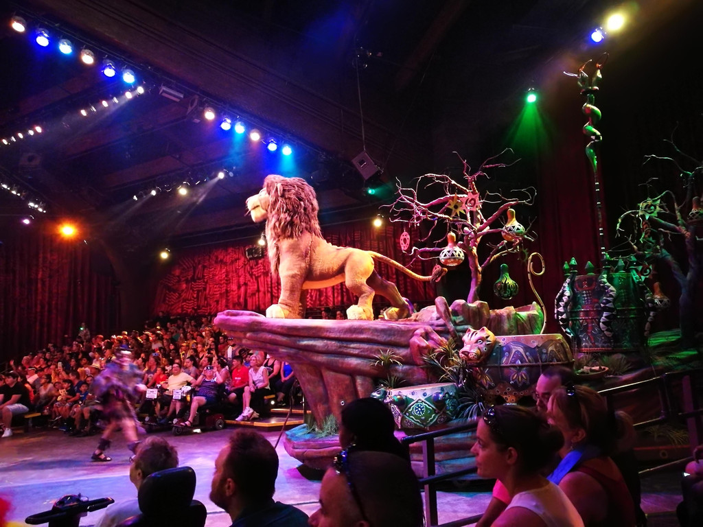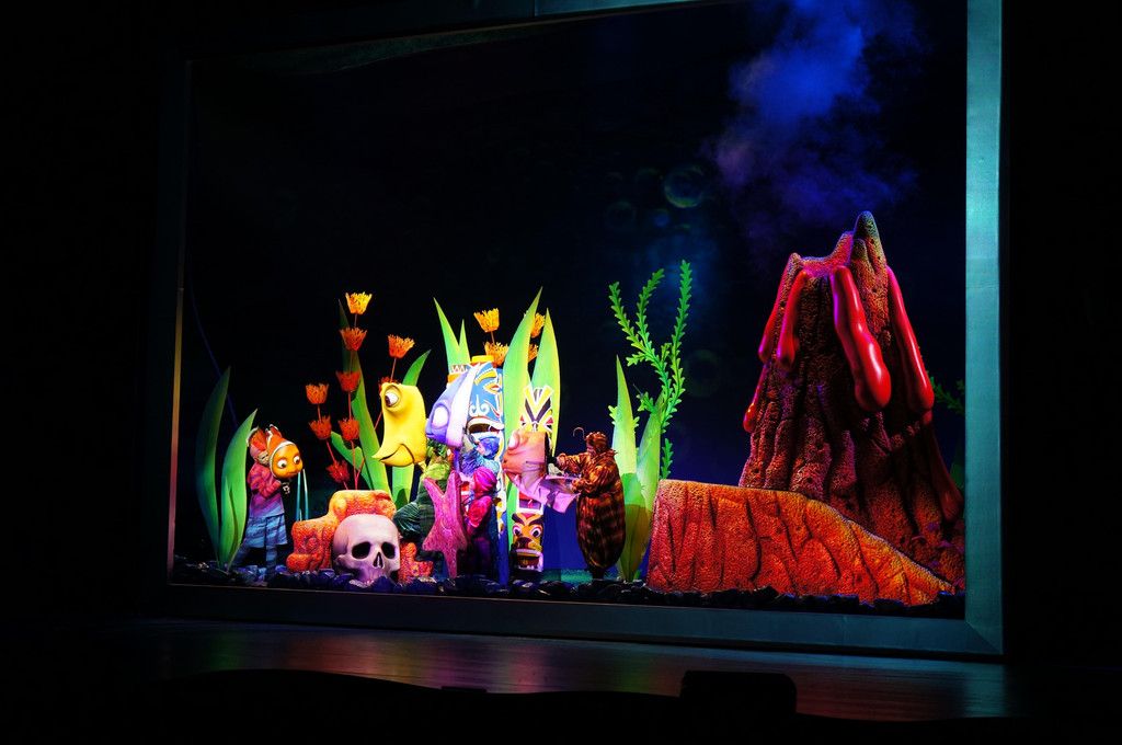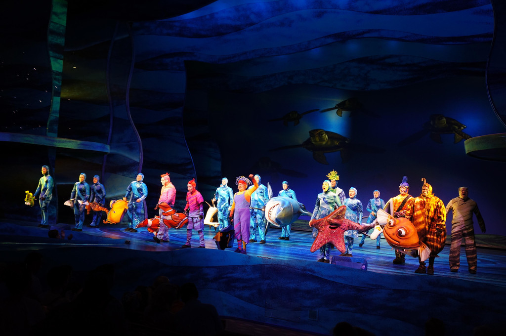 再来说说乐园里的Show,比Magic Kingdom里的Show要多。在剧场内孵孵空调,休息休息,的确很轻松呢。我们看了两部剧,一部是Lion King,还有一部是Finding Nemo,都是迪斯尼的经典动画片改编的。个人比较喜欢Finding Nemo,因为这是一部音乐剧,有情节有音乐,演员表演很到位,舞台设计也非常缤纷多彩。我和娃都看得很带劲,一旁的孩子爸爸竟然睡着了,好吧,的确是挺累的。这里要说的是,这两场show我都是用FP预约的,走了快速通道。然而实际上这种Show并不需要预约,因为一场Show可以容纳很多观众,所以基本上不需要等下一场,直接就可以排队进场,FP在此处并没有什么优势。