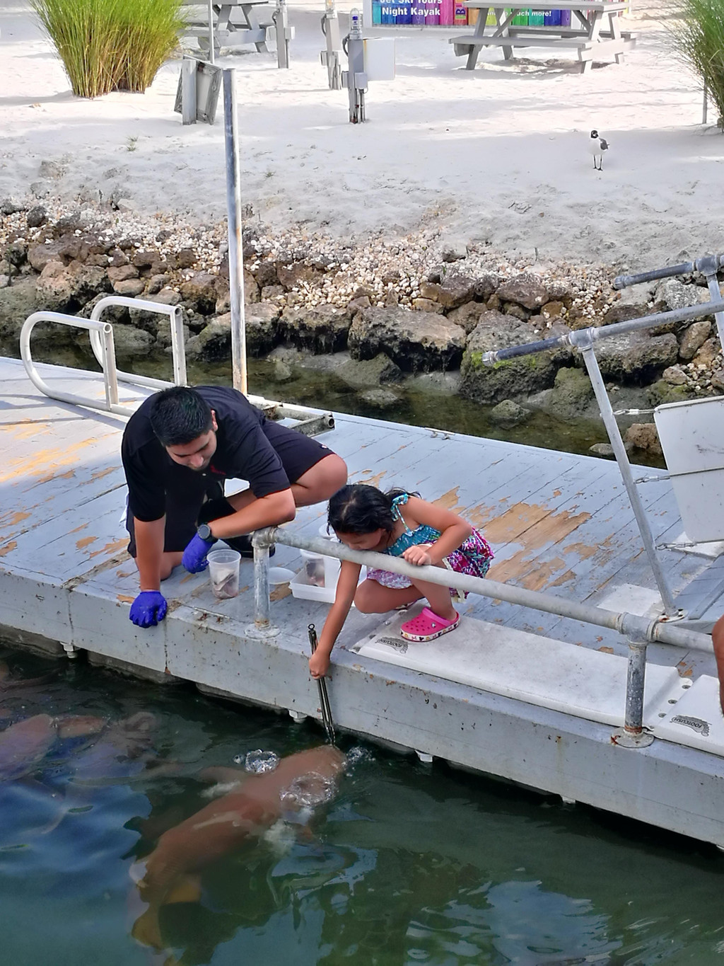 之后,我们还去了海龟池和海牛池。海龟馆里有专人在为学生族进行介绍,而海牛池更是养了好几条受伤和生病的海牛。整个参观给我的感觉是美国人很注重保护海洋动物,其实这个海洋公园不仅让游客来游玩,更重要的目的还是保护动物、救助动物,让来参观的游客都建立保护动物的正确意识和行为。