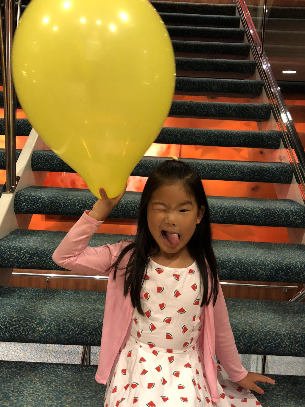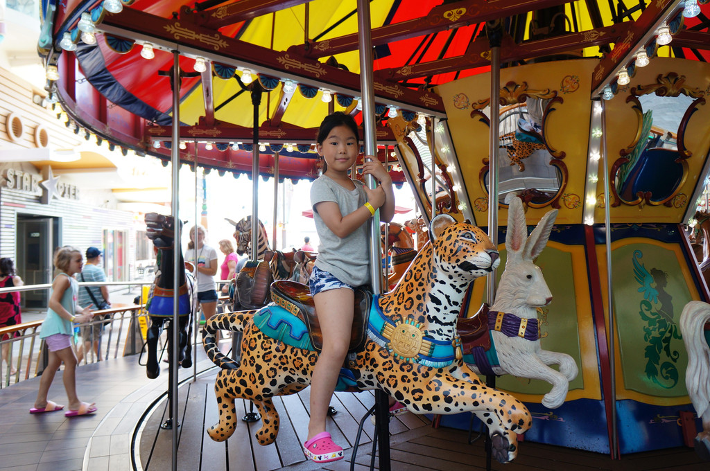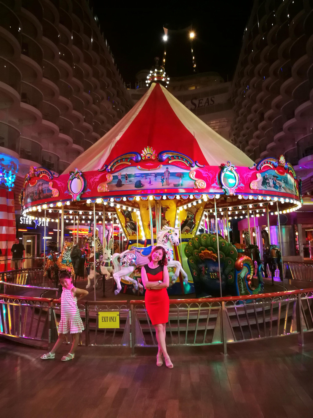 吃好浪漫的晚餐,甲板上走一走,一边消化一边吹吹海风。去Kids Club接娃,然后转战6层甲板看水上表演去。在这一层甲板上,有海上旋转木马,萱宝每天都要来坐好几回,反正每个动物都做过了。水上表演十分精彩,请了专业的跳水运动员来表演,尤其是从最高的跳台往水池里跳,好惊险啊。