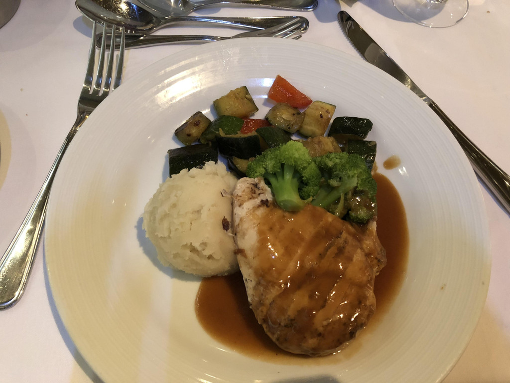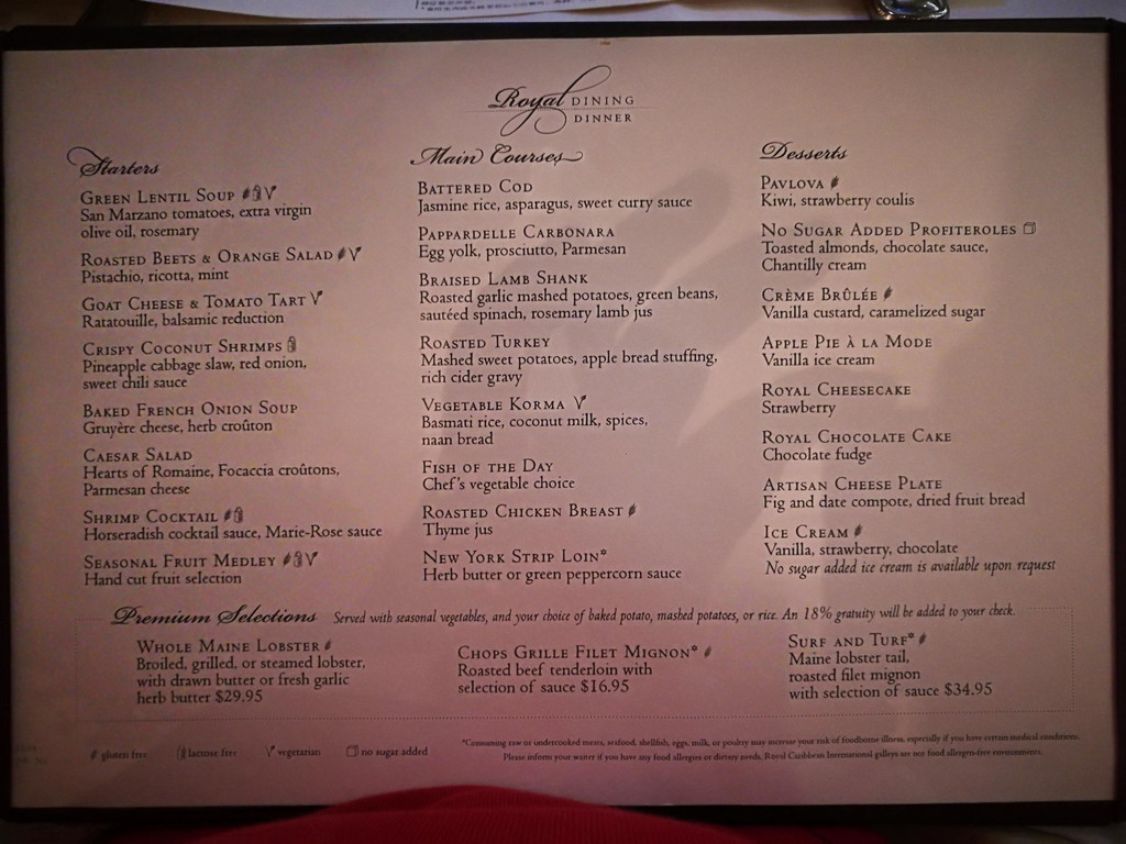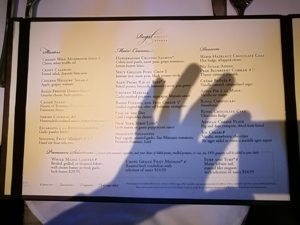 邮轮上的晚间时光就是休闲之夜—晚餐+看Show+闲逛。我们的晚餐订的是My Time,就是不限定时间段。晚餐仍然是传统的三道式晚餐-前菜+主食+甜品,饮料有冰水、柠檬水、红茶可以免费点,其他饮料或菜肴需要另外付费。说实话,这样的英文菜单还是比较难理解的,因为有不少食物的英语都是专有名词,我和孩子爸爸是拿着手机,一边看一边用翻译的,大致就能了解到每道菜的原料和口味。主餐厅里还有其他语言的菜单版本,当然也有中文版的。后面的几天我们都拿了中文菜单来看,不过可能是用翻译软件翻译的,中文看上去意怪怪的,不太好理解,呵呵。