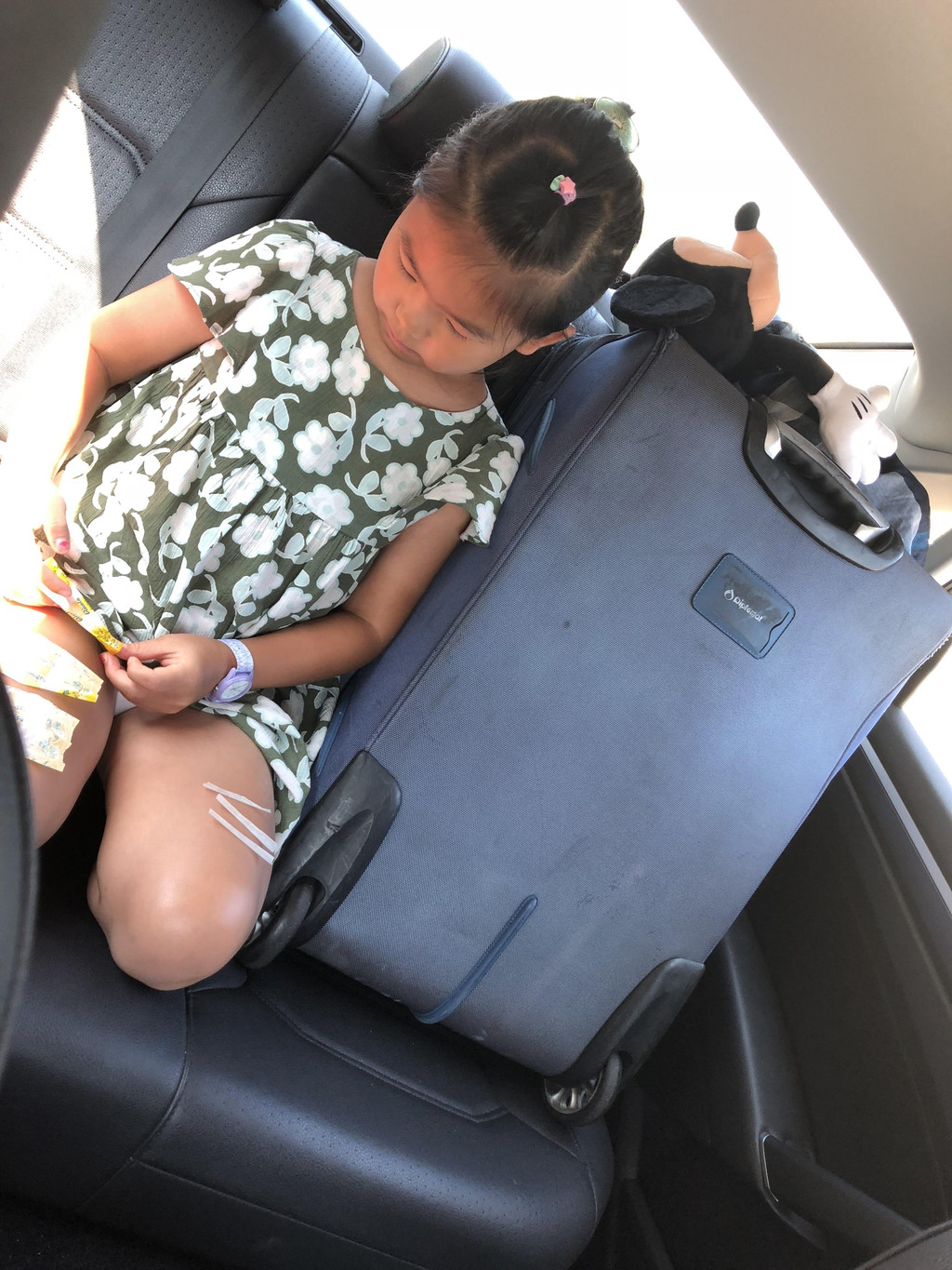 目前为止,我们行李一共有4个大箱子,后备箱塞了三个,还有一个放在了后座,和萱宝做邻居,哈哈。。上午9点多,我们启程啦!