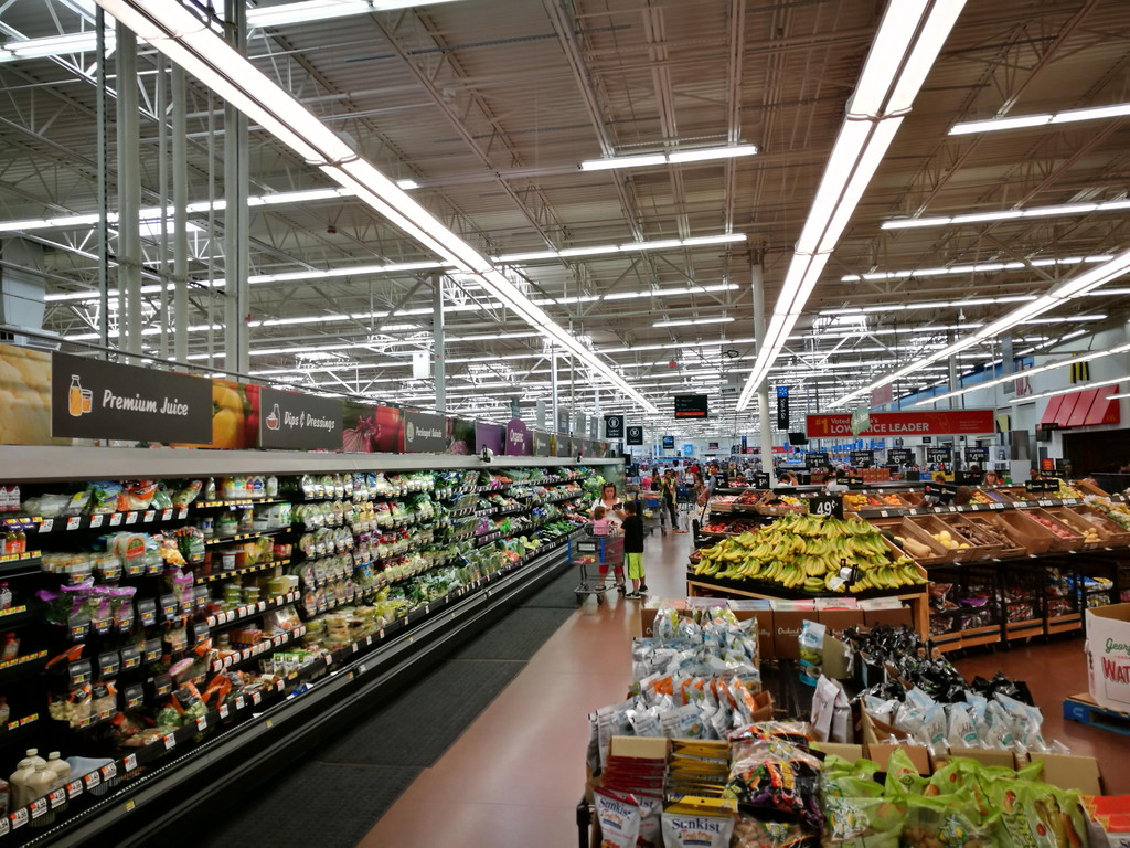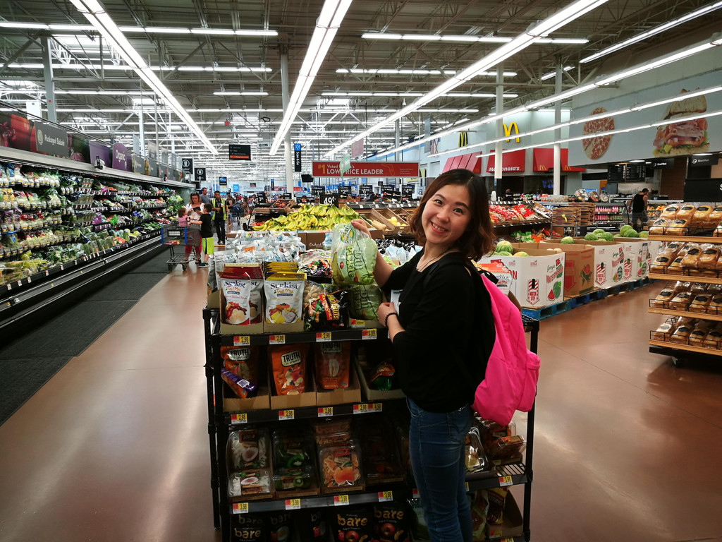 去酒店的路上,我们顺路去了一趟Walmart沃尔玛,采购一些这几天的食物和饮料、水。沃尔玛是美国超市,所以到处可以看到,而且里面商品的价格也的确蛮实惠的。不过有意思的是,在美国,包括以前几次去欧洲,都发现水很贵,六瓶小的柠檬水要1.6美元,大瓶的就更贵。可乐一瓶也要一点几美元。反而是果汁啥的,很大一瓶,1L左右的,也就1.5美元。我们拿了面包、小饼干、薯片、梨、橙子、水和苹果汁之后,就去自助机器上付款了:自助扫条形码、刷信用卡、拿好购物小票,方便快捷,走人!