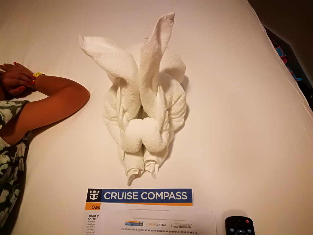 吃完晚饭,到5层的皇家大道去逛逛。本来娃说要到Rising Bar去坐坐,因为这个酒吧是可以升高和下降的。然而事实是,娃晚餐吃到一半,就撑不住睡着了。我们也只能抱着娃,随便逛一圈,就回房间啦。一进房间,就看见床上放着服务员为我们折叠的浴巾兔子,很有心意吧。明天开始,就是连续三天的岸上观光日了,要早起了。我们填写好早餐送上门的单子,挂到门把手上,就洗洗睡下了。