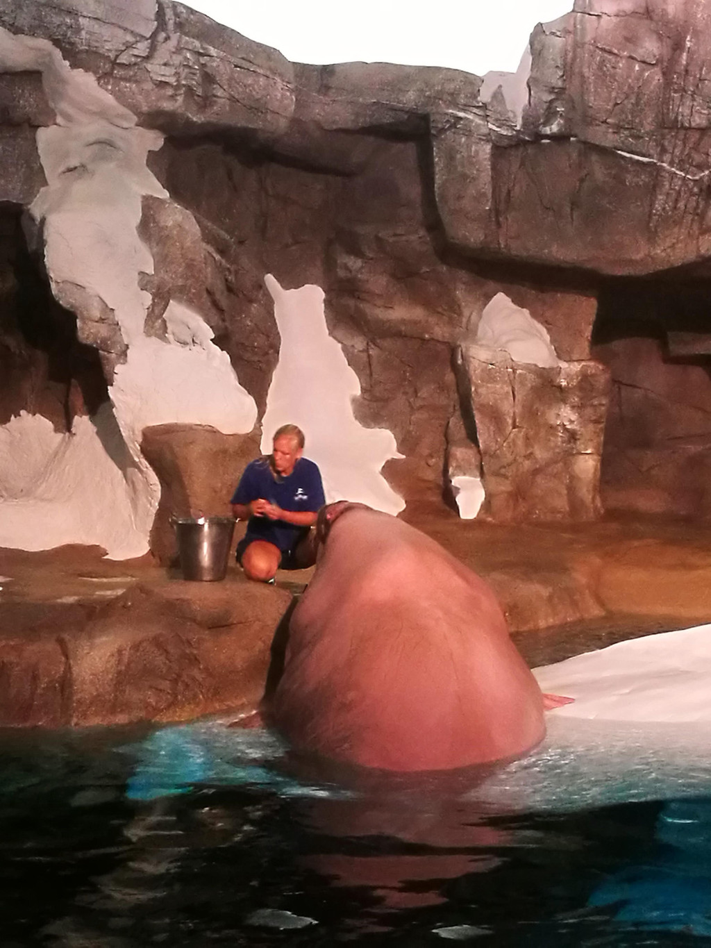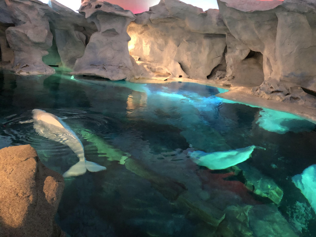 时间过了好快,一晃海洋动物都看了,表演也看了,往回走的时候,路过一个极地馆,想进去看一看,但是排队队伍有点长,开始纠结,最后还是果断排队,进去开个眼界,果然不负近一个小时的排队。先是看一段4D影片,坐上极地直升机,探索极地风光,一会儿上升,一会儿加速,最后一下子俯冲,非常刺激。接着舱门打开,我们就进入了极地动物馆,看到了生活在北极的珍稀动物白鲸和海象。