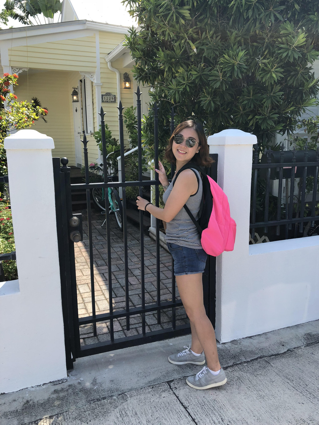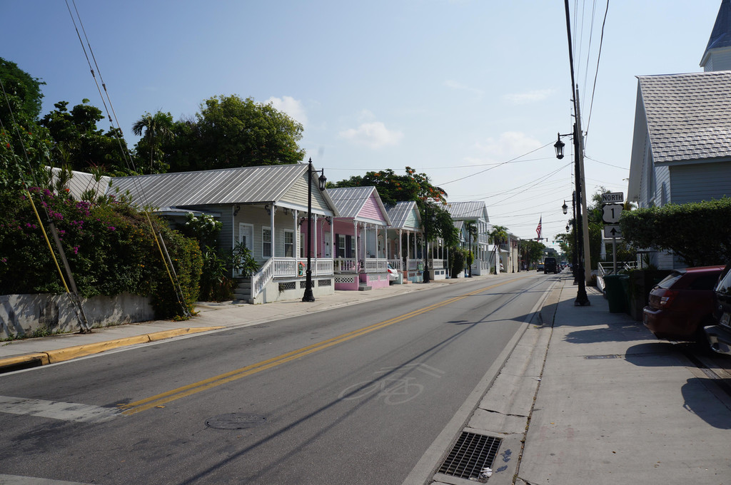 最南端标志到此一游,我们继续沿着Whitehead Street往回走,一边走,一边继续欣赏两边的小洋房。在有些小洋房的篱笆外面,地上扔着报纸。这让我想到以前看一些美国电影,送报纸的邮递员都是一边骑自行车,一边把报纸一扔,如今果然在实地看到这样的场景啦。这些小洋房看起来似乎都没有人住,但是车库里停放的汽车以及花园里摆放的藤椅,却告诉我肯定有人住,只是这边环境太幽静了,即使主人在屋子里,你也不觉得吧。我还偷拍了好多花园洋房的照片,还有自己站在人家篱笆前面拍的照片,真的好像“刘姥姥进了大观园”一样。