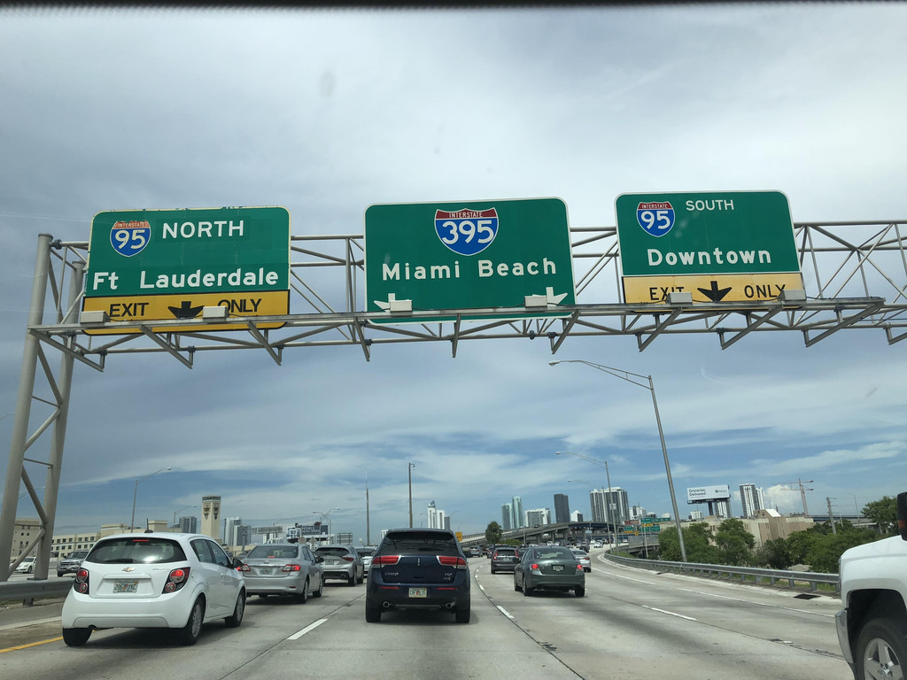 果然是雨季了,一路上暴雨阵阵,一直进入迈阿密,阳光普照。一进入迈阿密,进入眼帘的是两旁林立的高楼、车水马龙的公路、头顶上低低飞过的飞机、还有港口上停靠着的一排大邮轮,让我感觉:终于来到一个热闹繁忙的大城市啦!迈阿密地形独特,位于比斯坎湾的海滨,包括数百个自然的或人工的群岛,这些小群岛像屏障似的,将迈阿密中心地区和大海相隔。迈阿密市内河道众多、小岛众多,所以道路错综复杂,一不小心就会开错,这时候我们只能无条件信赖导航啦!