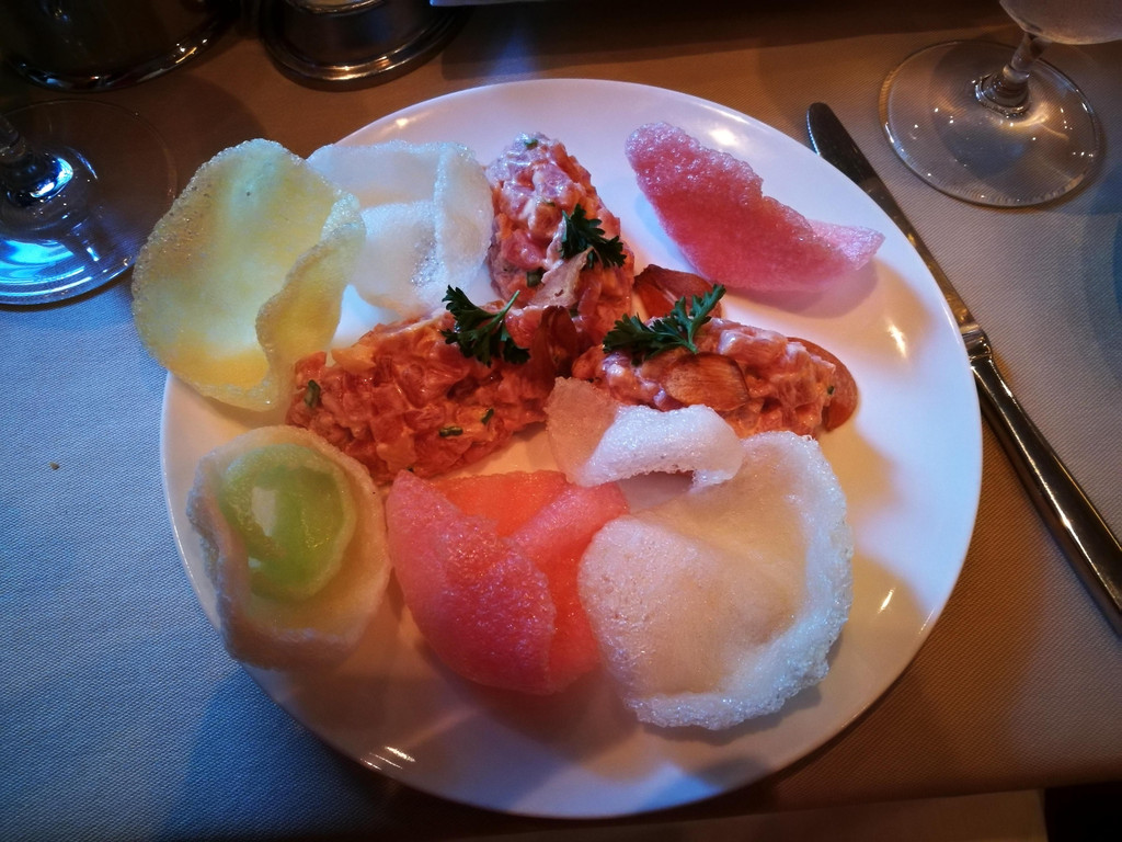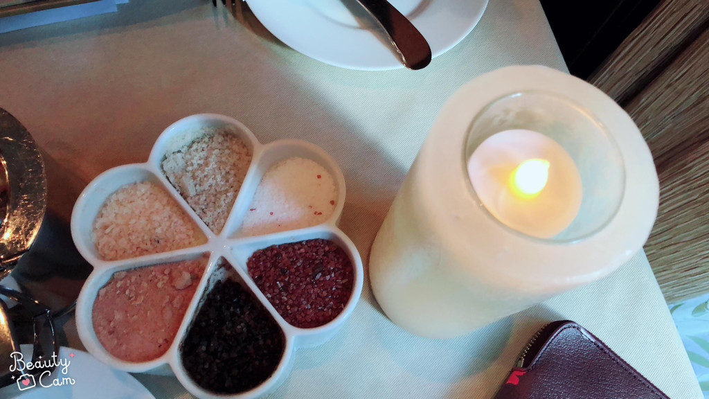 在出发之前,孩子爸爸很有心地从加勒比邮轮官网上下载了这家餐厅的英文菜单,还花了不少时间进行菜名的翻译。(此处给孩子爸爸的用心点100个赞!)这样,点菜时也不至于太一头雾水。服务生非常热情、周到,给我们介绍了罐子里六种不同地区的盐。(我也不知道为什么要跟我们介绍盐。。。)还给我们推荐了今日的主打菜肴。以下是我们各自点的菜肴: